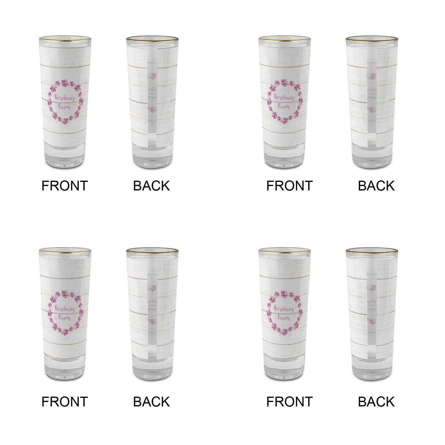 These glass shooter glasses are printed in full color with the design of your choice. These are a tall shooter 2 oz size and stand 4" tall. The print is a full wrap design to boldly display your personalization.