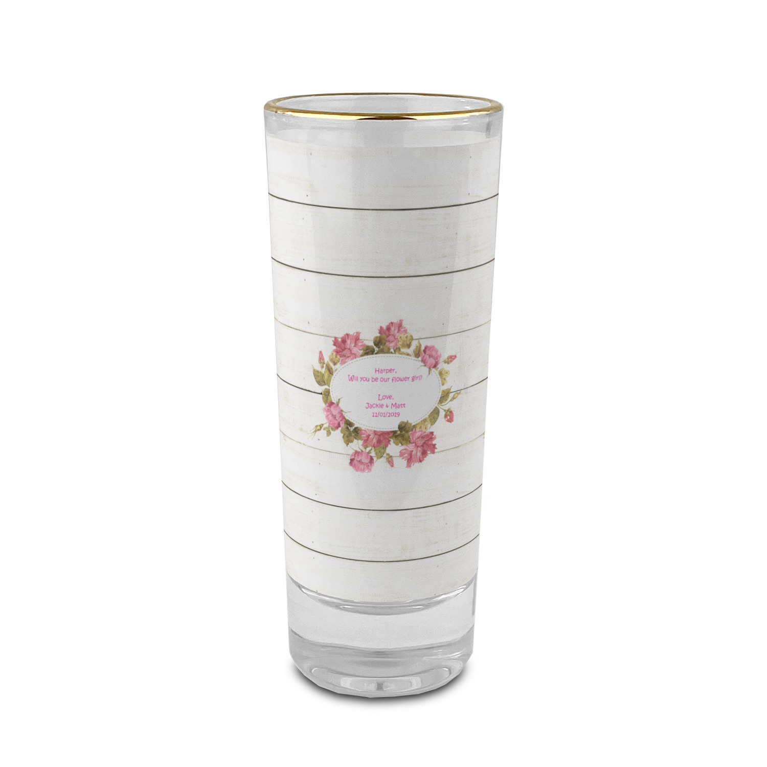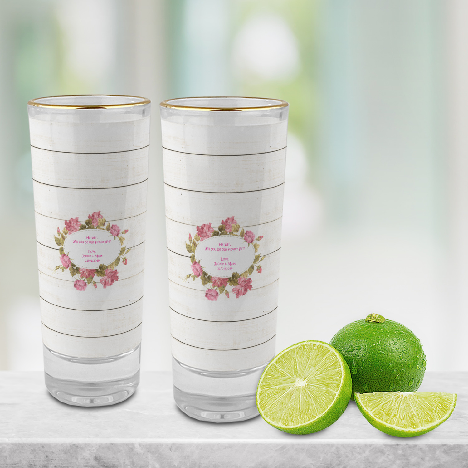 These glass shooter glasses are printed in full color with the design of your choice. These are a tall shooter 2 oz size and stand 4" tall. The print is a full wrap design to boldly display your personalization.