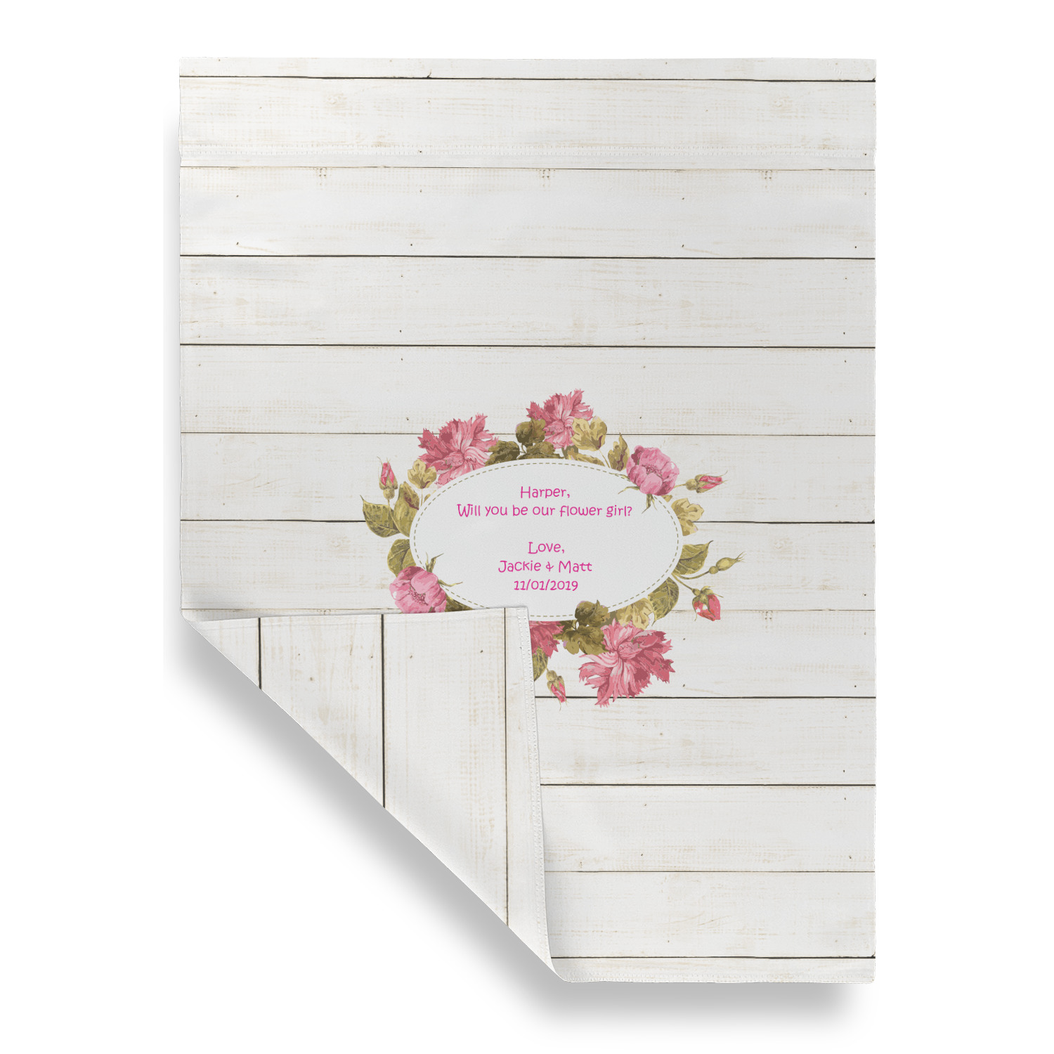 The main design has a background of weathered wooden planks. A beautiful light pink flower frame is used as the focal point of this design. The pink color of the frame and the personalization inside is the perfect contrast to the light colored wood.