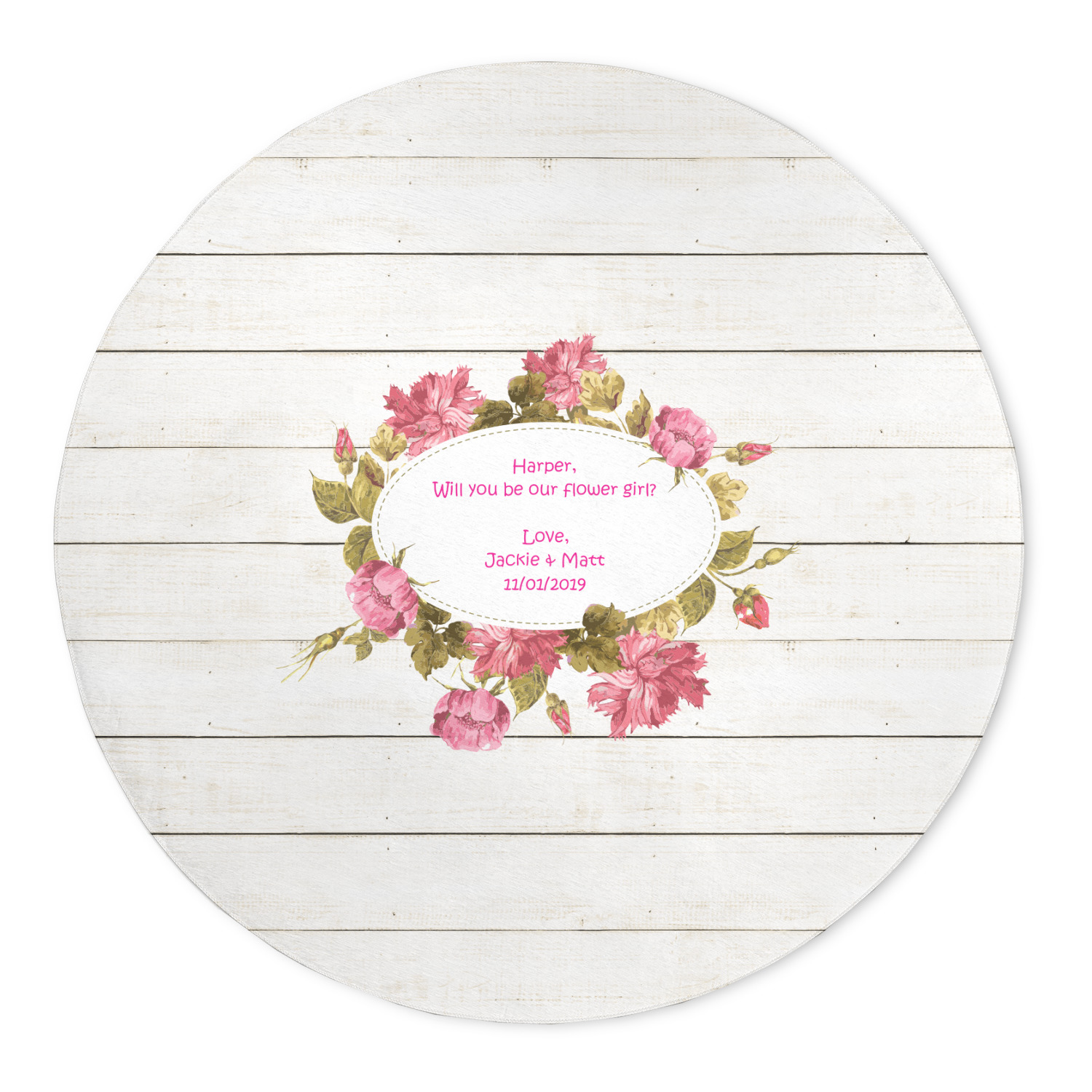 The main design has a background of weathered wooden planks. A beautiful light pink flower frame is used as the focal point of this design. The pink color of the frame and the personalization inside is the perfect contrast to the light colored wood.