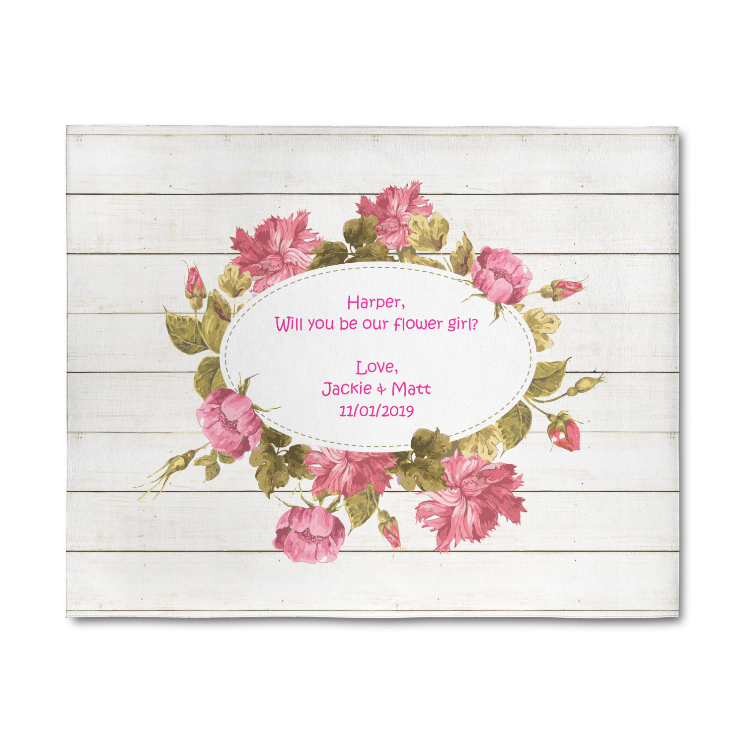 The main design has a background of weathered wooden planks. A beautiful light pink flower frame is used as the focal point of this design. The pink color of the frame and the personalization inside is the perfect contrast to the light colored wood.