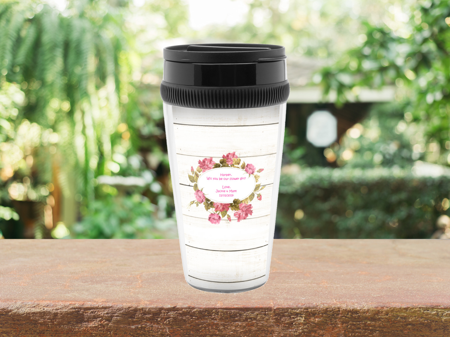 The main design has a background of weathered wooden planks. A beautiful light pink flower frame is used as the focal point of this design. The pink color of the frame and the personalization inside is the perfect contrast to the light colored wood.