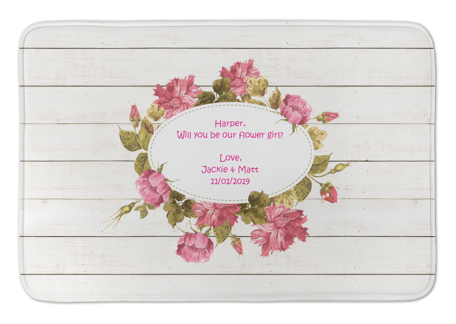 The main design has a background of weathered wooden planks. A beautiful light pink flower frame is used as the focal point of this design. The pink color of the frame and the personalization inside is the perfect contrast to the light colored wood.