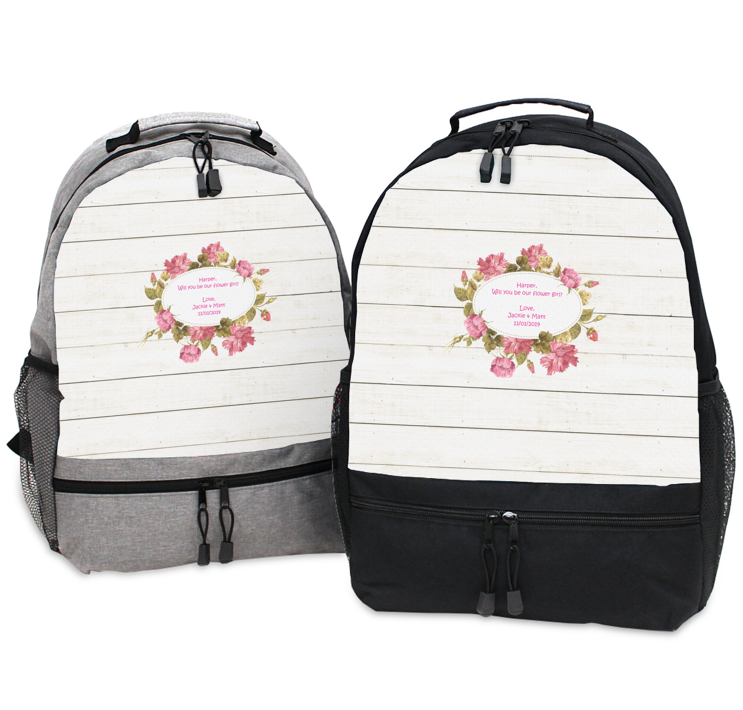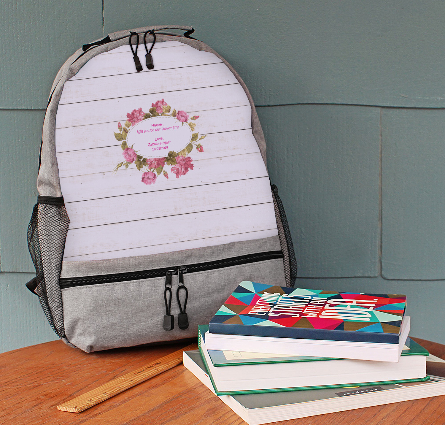 The main design has a background of weathered wooden planks. A beautiful light pink flower frame is used as the focal point of this design. The pink color of the frame and the personalization inside is the perfect contrast to the light colored wood.