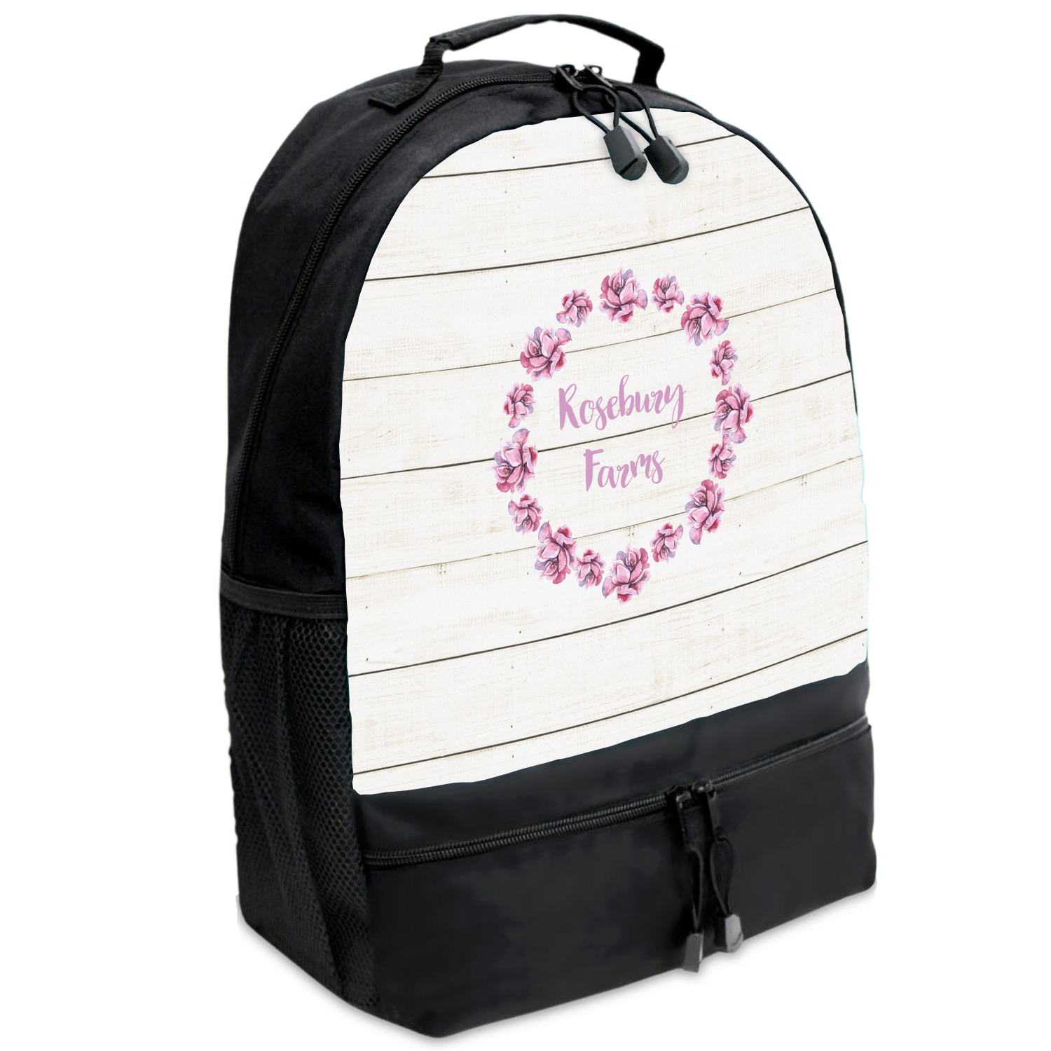 The main design has a background of weathered wooden planks. A beautiful light pink flower frame is used as the focal point of this design. The pink color of the frame and the personalization inside is the perfect contrast to the light colored wood.