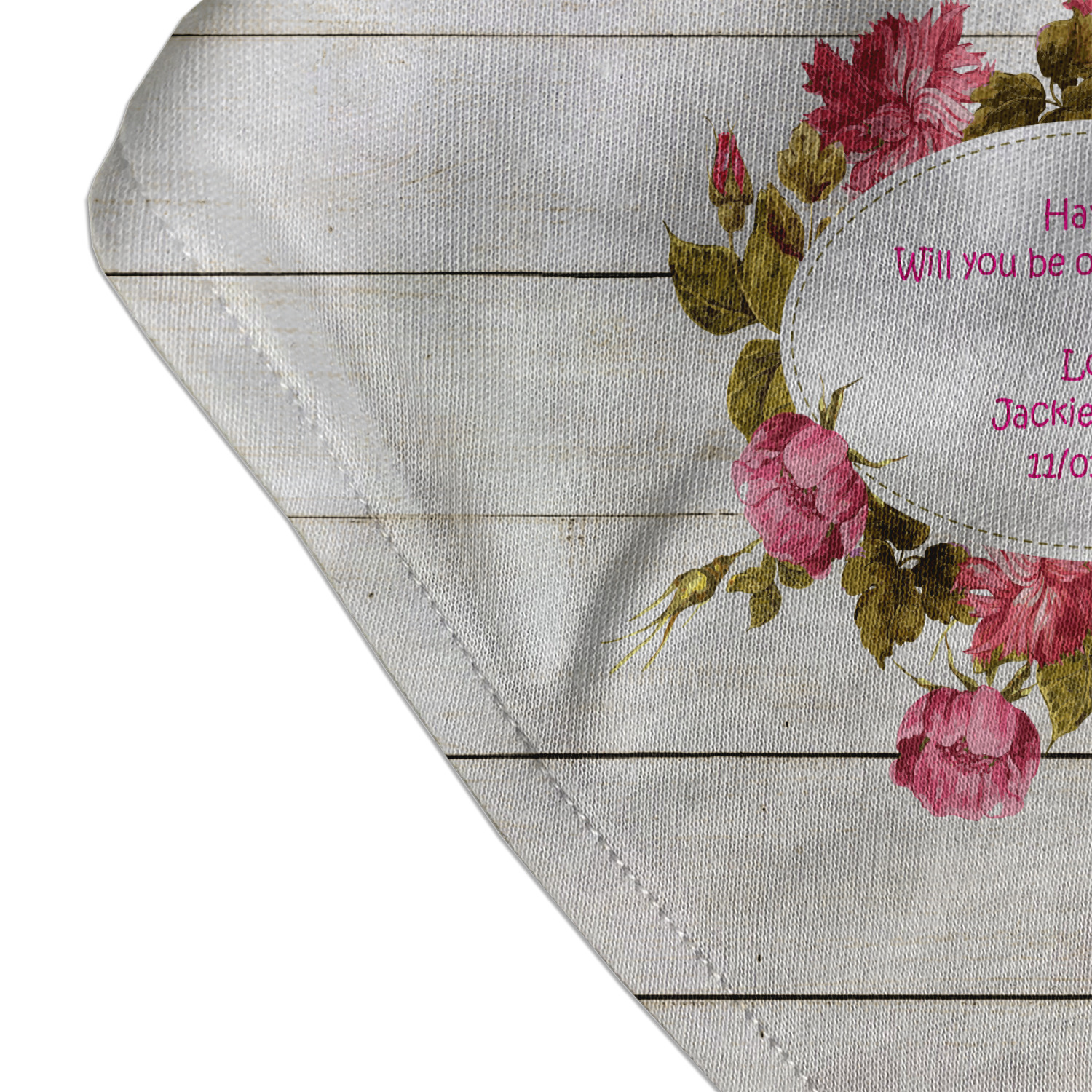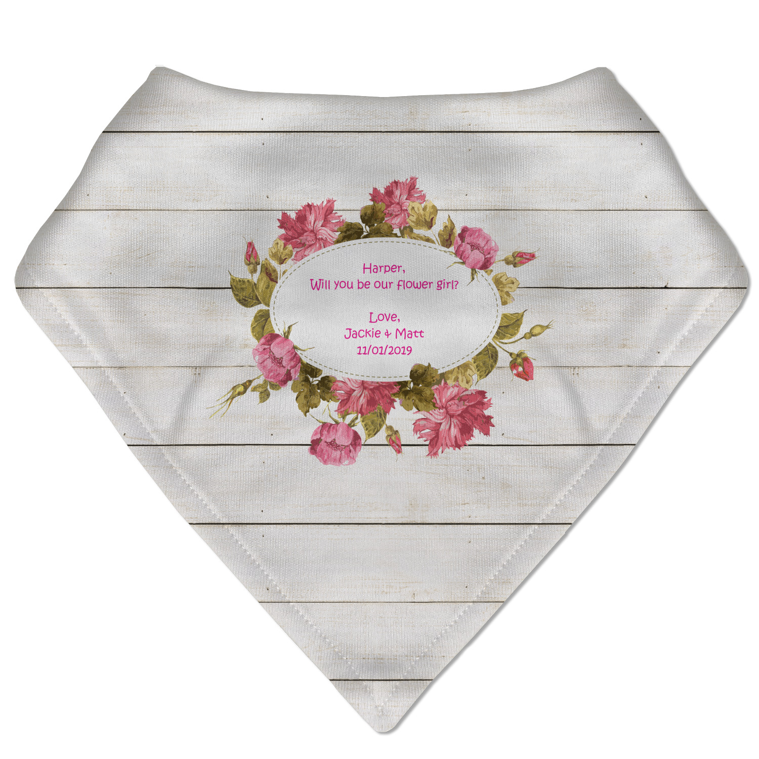 The main design has a background of weathered wooden planks. A beautiful light pink flower frame is used as the focal point of this design. The pink color of the frame and the personalization inside is the perfect contrast to the light colored wood.