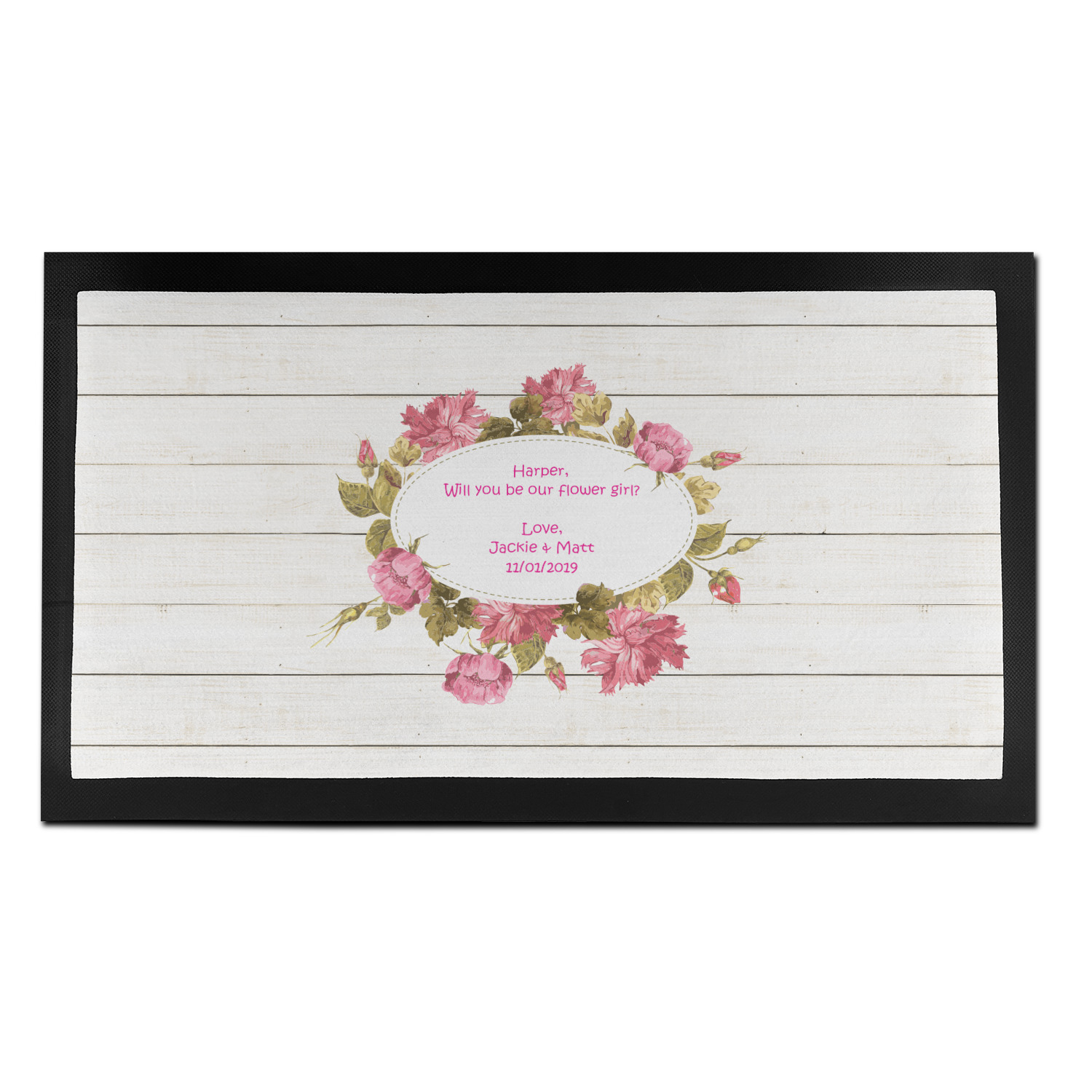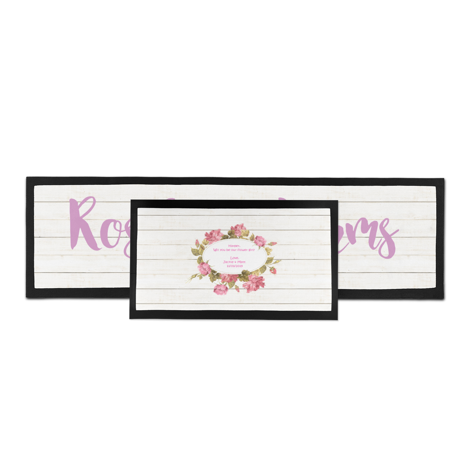 The main design has a background of weathered wooden planks. A beautiful light pink flower frame is used as the focal point of this design. The pink color of the frame and the personalization inside is the perfect contrast to the light colored wood.