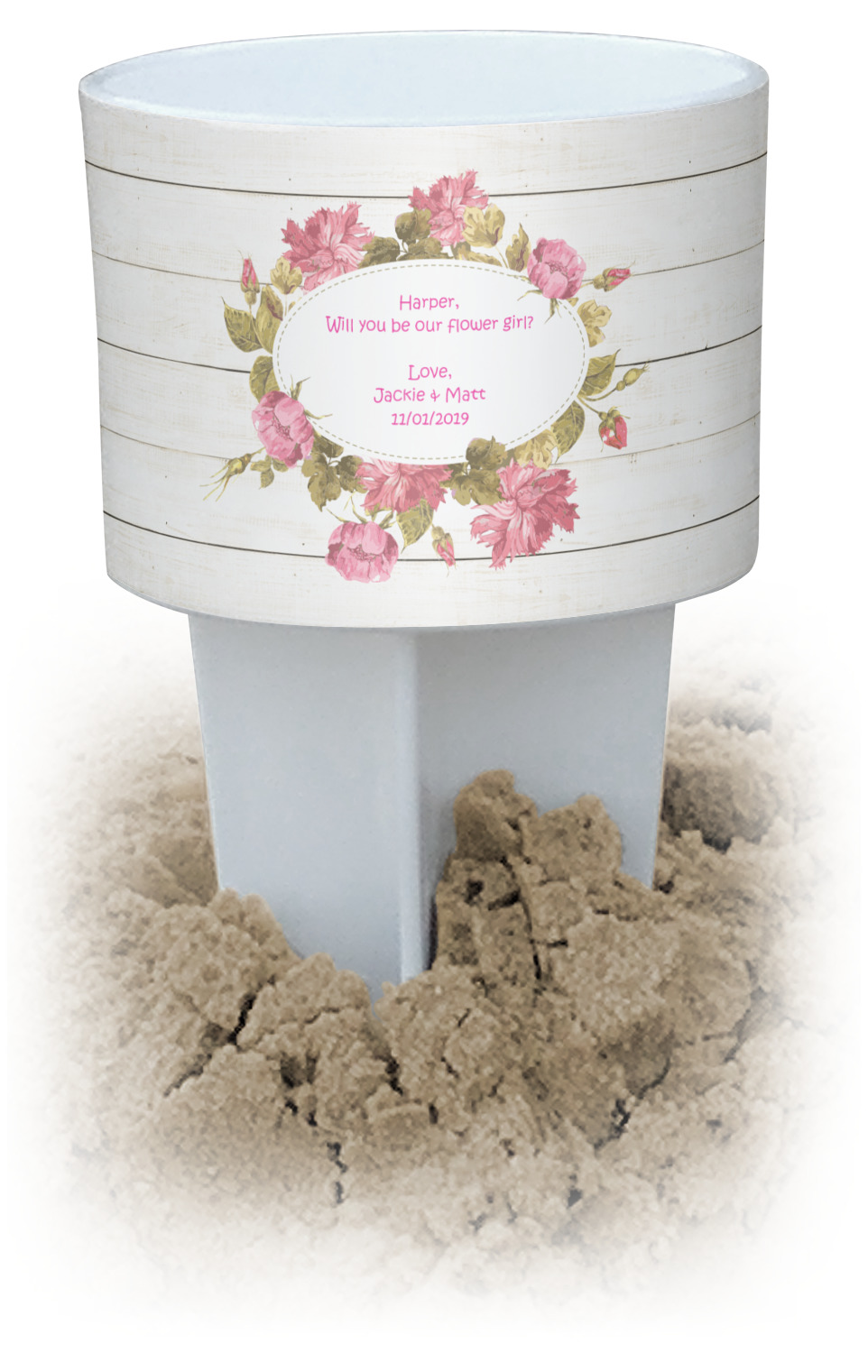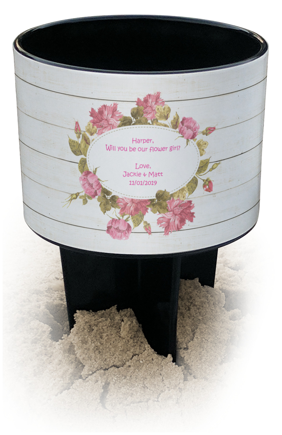 This cup holder has a large stake at its bottom that anchors it to the sand or ground below, while the cup holder rests above the stake. The entire drink holder is made of durable plastic and displays your customization around the cup holder portion. We sell these personalized beach spikers in two different colors: black and white.