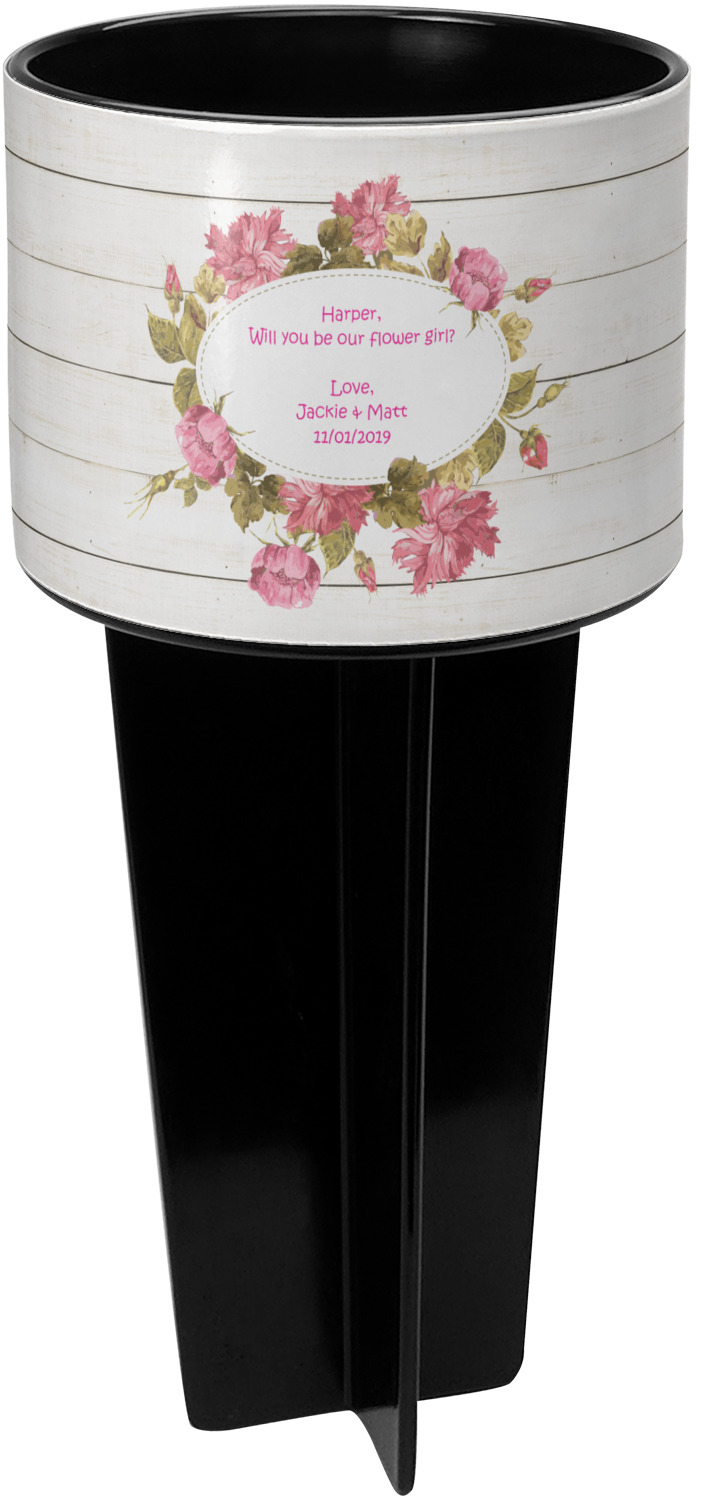 This cup holder has a large stake at its bottom that anchors it to the sand or ground below, while the cup holder rests above the stake. The entire drink holder is made of durable plastic and displays your customization around the cup holder portion. We sell these personalized beach spikers in two different colors: black and white.