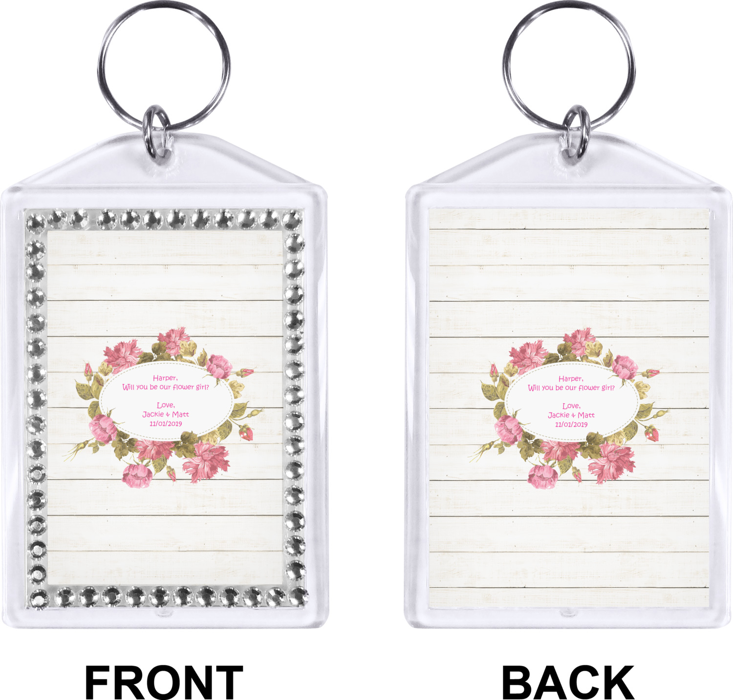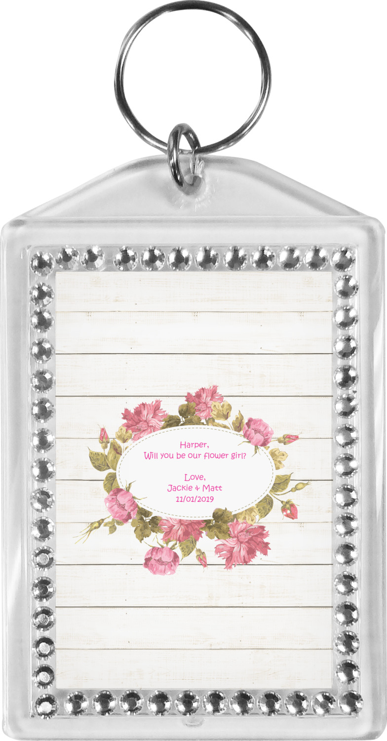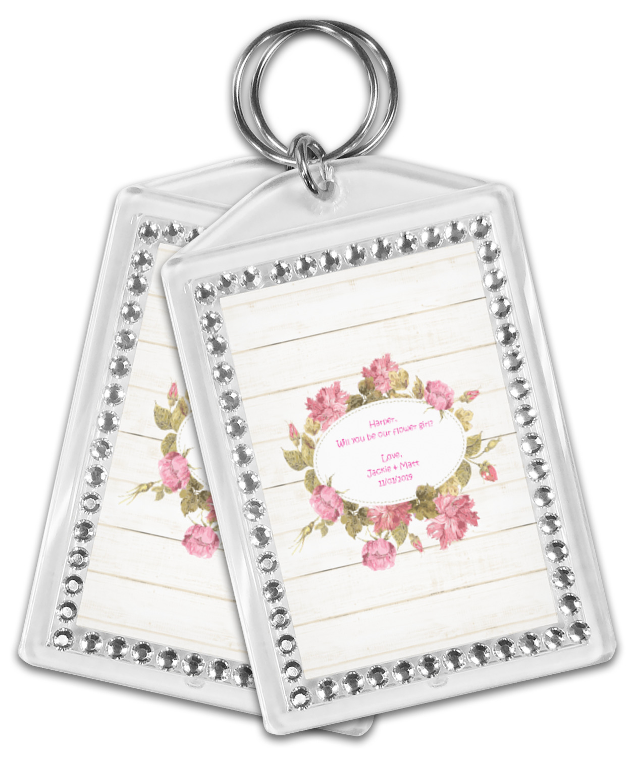 Our personalized keychains have a bold, rectangular shape, outlined by a series of shimmering rhinestones. A metal, split keyring is included with your purchase, and an additional metal hoop allows for attachment of the keychain to the split ring. This unique keychain measures at about 3.75 by 2.5 inches. We print your customized design(s) across both the back and front of this keychain.