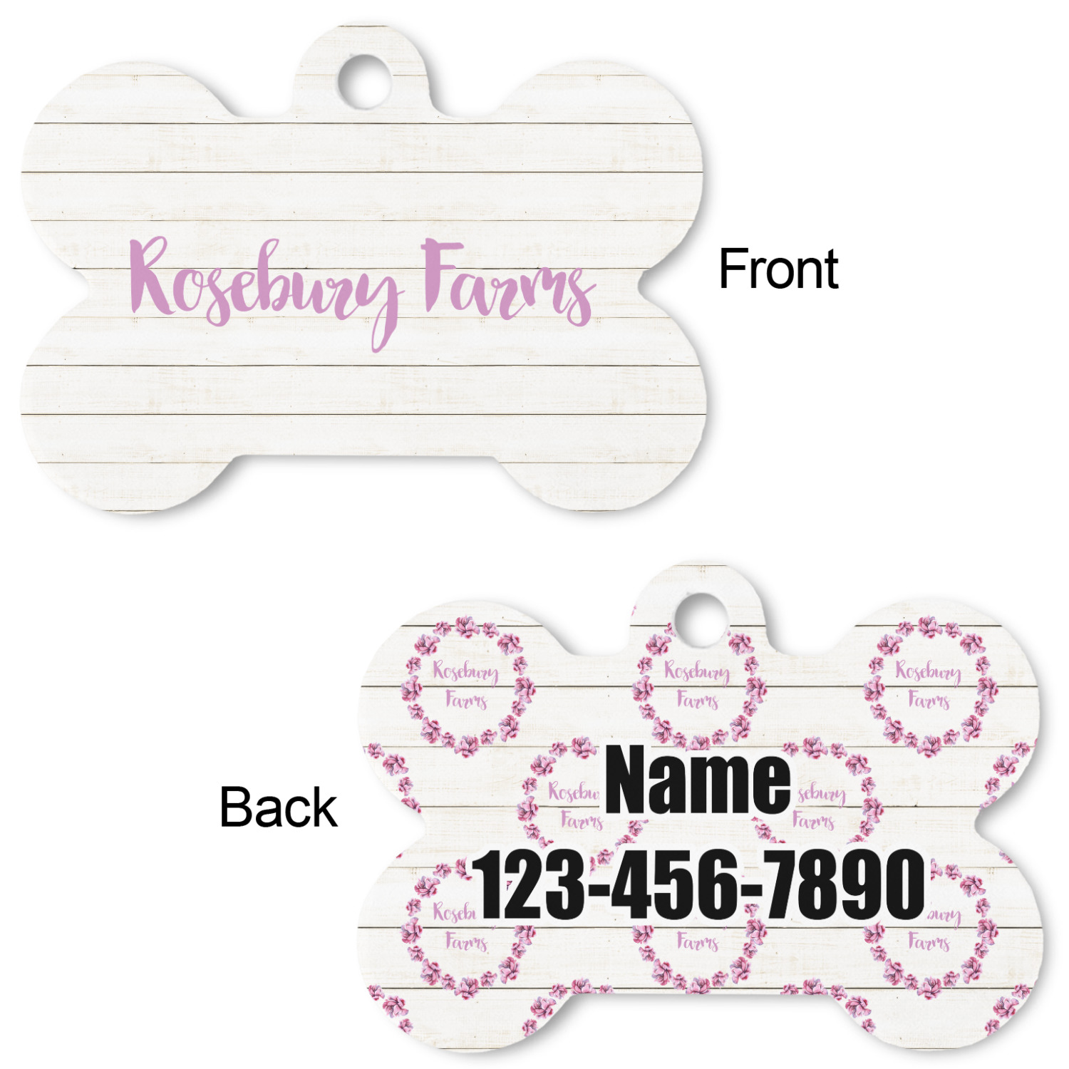 Our default design templates print your dog's personalization on the front and your contact information on the back; however everything is customizable, so you customize the patterns, the colors, the personalization, the contact information etc.