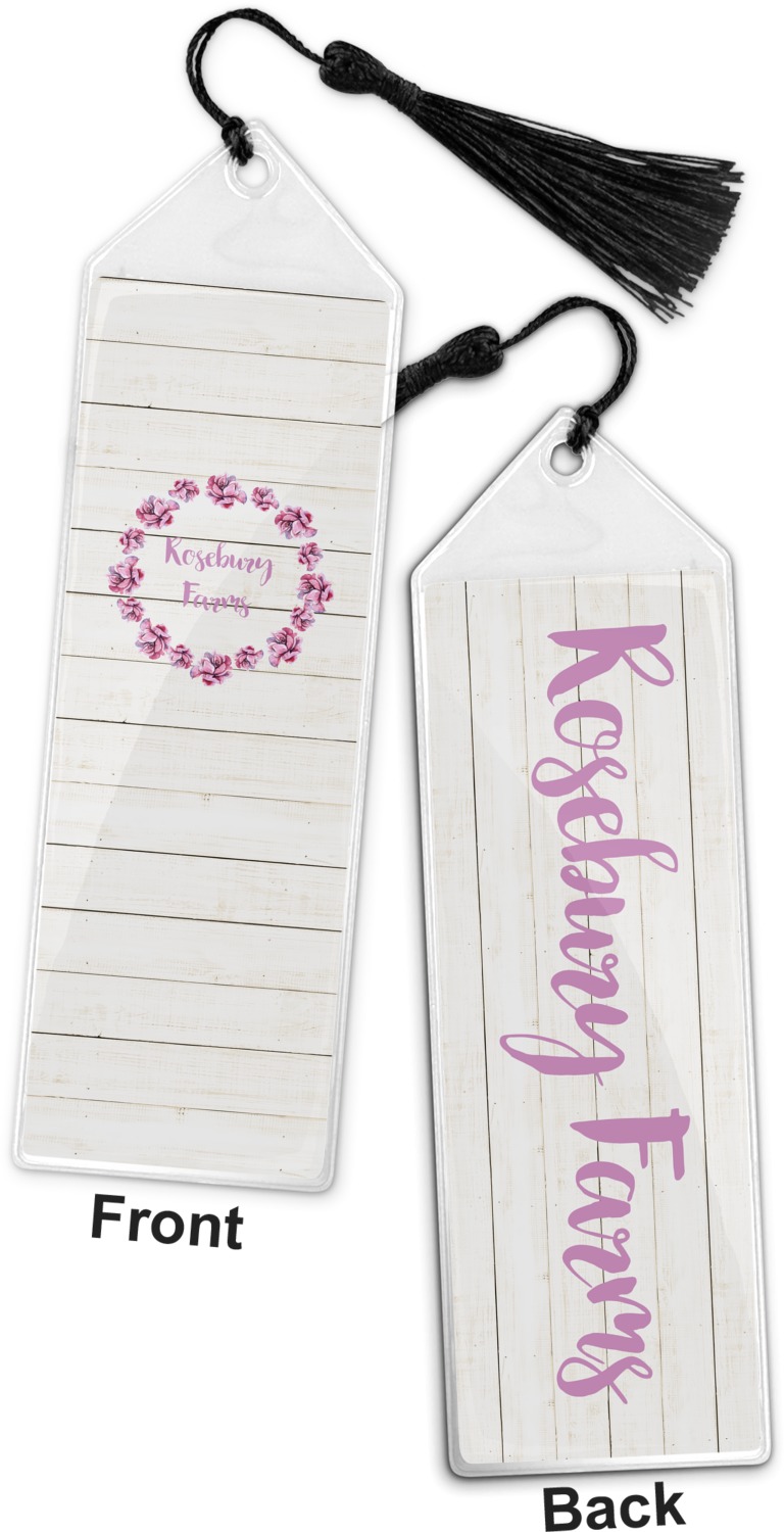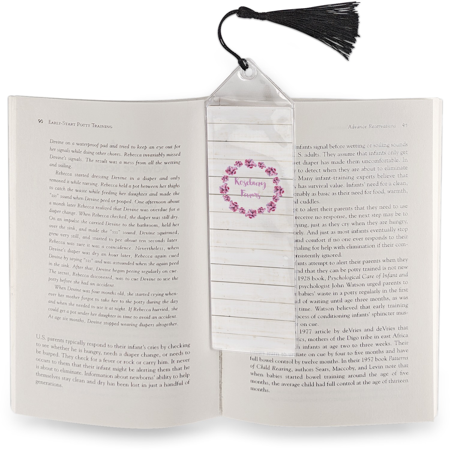 Your personalized bookmark is made of a sturdy, clear vinyl, and is approximately 7.5" x 2.25". We display your personalization on vinyl inserts that are placed on both sides. Accompanying each book marker is a black, fringe tassel that attaches to the reinforced, triangular header.