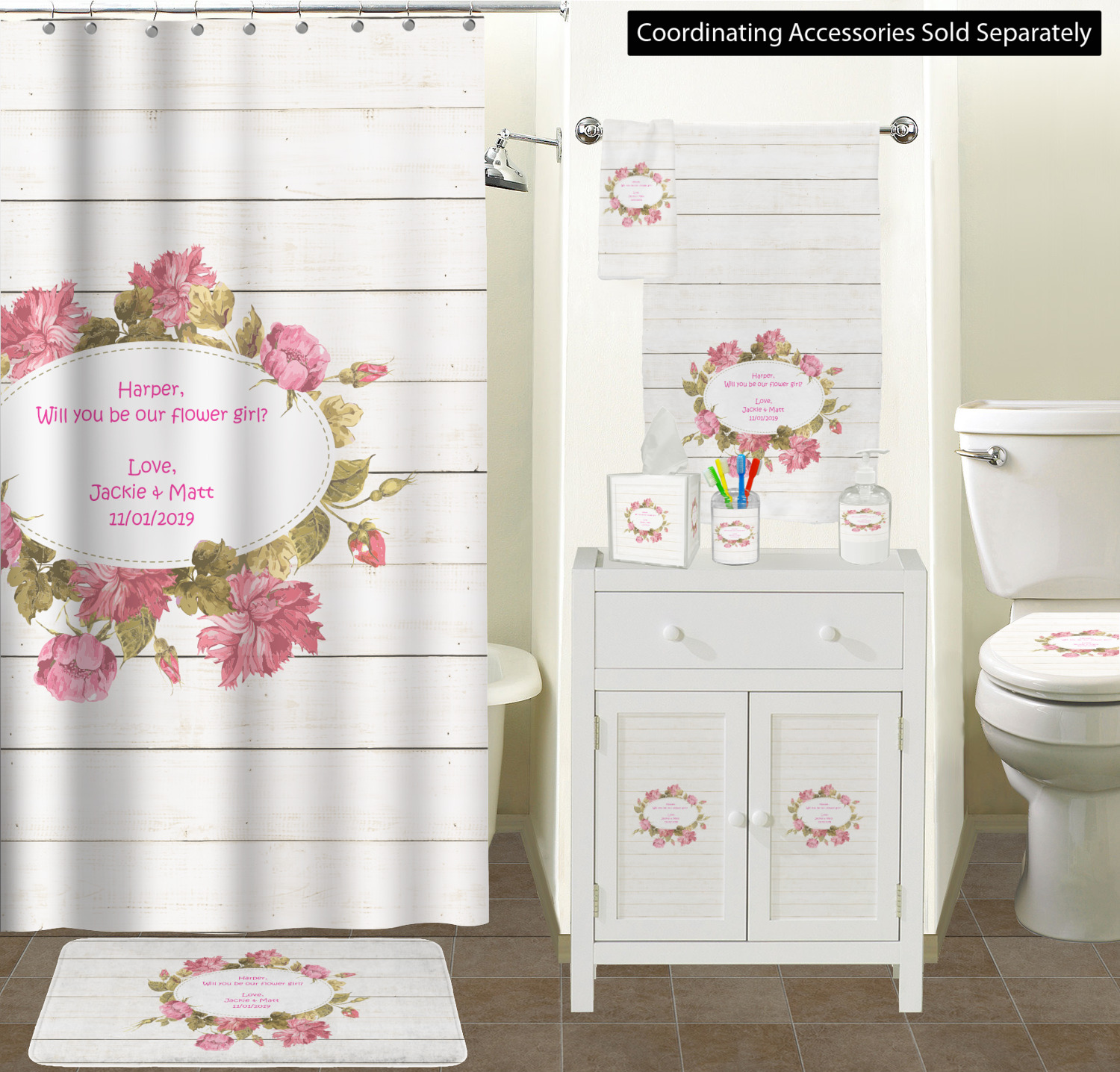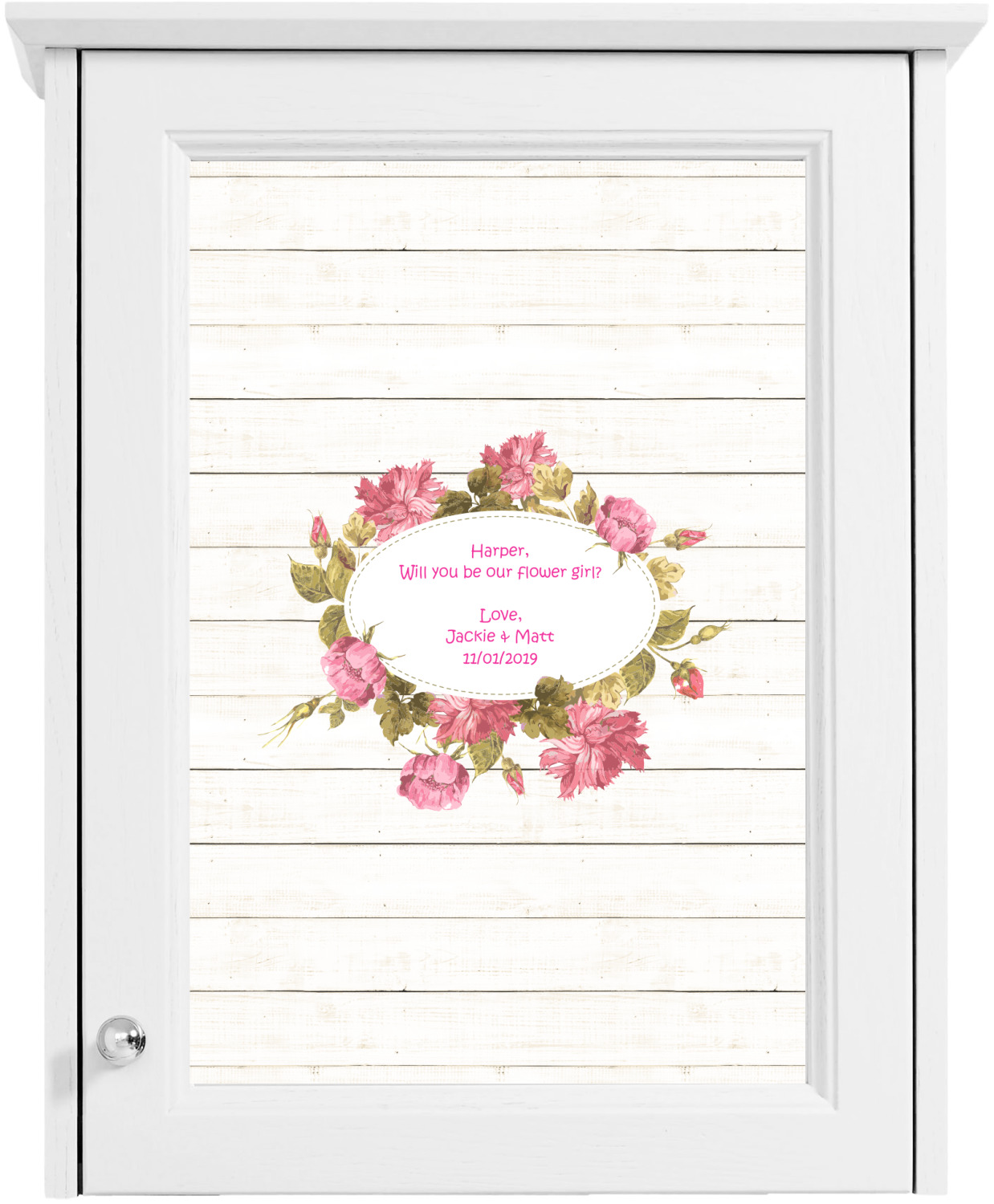 The main design has a background of weathered wooden planks. A beautiful light pink flower frame is used as the focal point of this design. The pink color of the frame and the personalization inside is the perfect contrast to the light colored wood.
