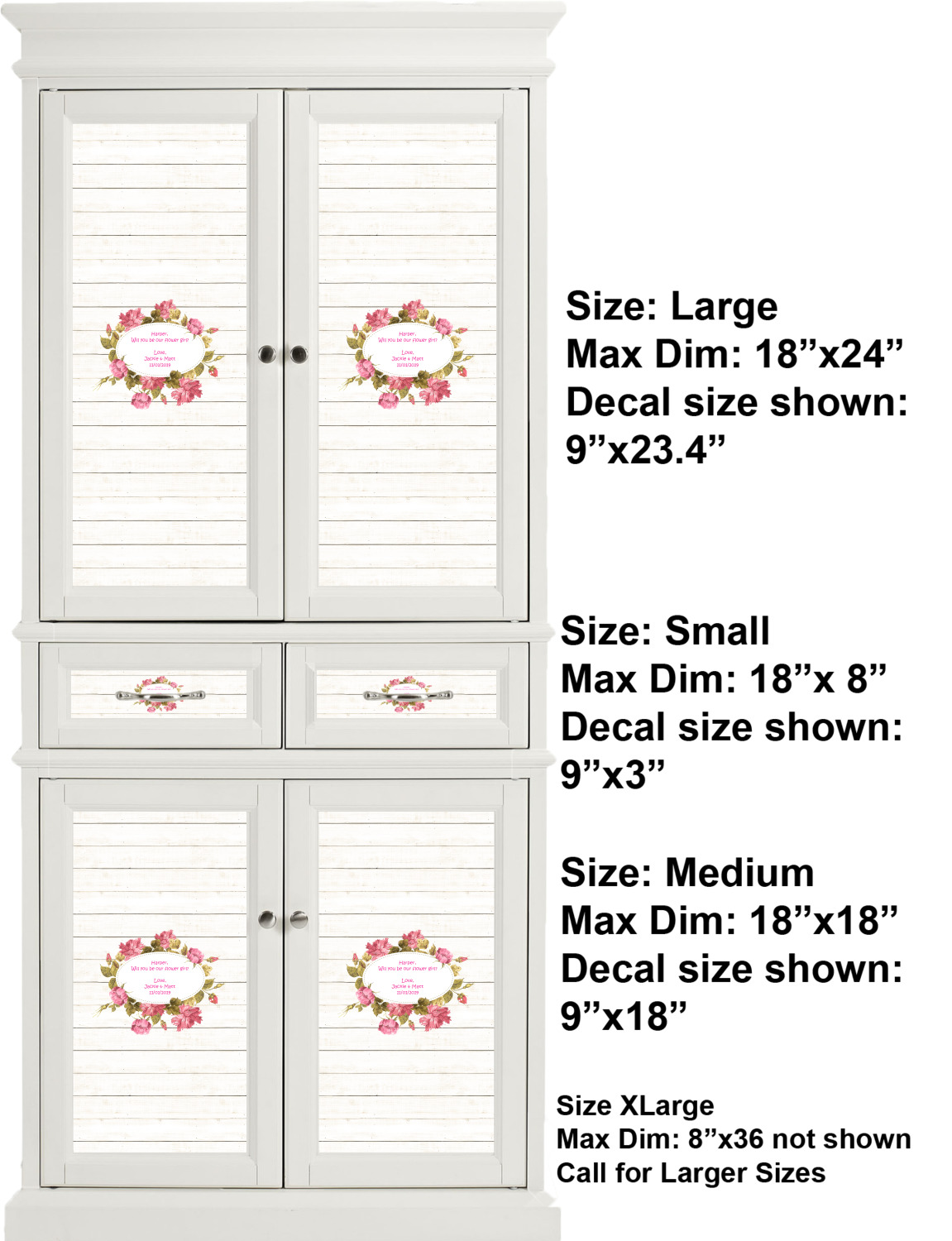 We print your customized design in full color, onto a high quality vinyl, covered with a glossy finish. For attachment to the cabinet, each cabinet sticker is accompanied by an easily applied, adhesive backing. The adhesive backing also guarantees a smooth removal or repositioning if desired. We sell these decals in four different sizes, but each size can be downsized appropriately to fit the needs of your kitchen. We offer a small, which is 18 by 8 inches, a medium, which is 18 by 18 inches, a large, at 24 by 18 inches, and an extra large, at 36 by 18 inches. We advise that you measure your cabinets first so you can make a properly informed purchase. For those who are interested in purchasing decals larger than 18 by 36 inches, please contact our team.