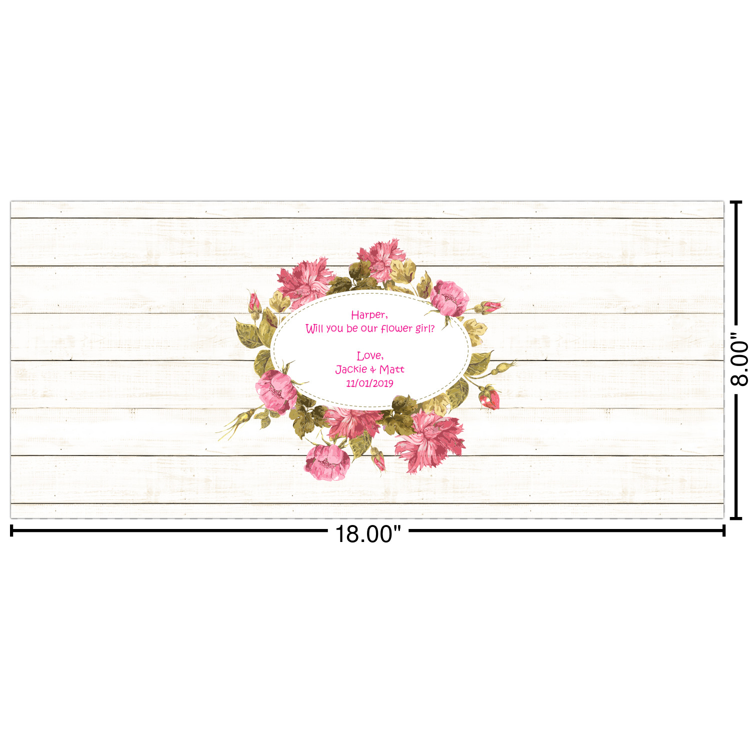 The main design has a background of weathered wooden planks. A beautiful light pink flower frame is used as the focal point of this design. The pink color of the frame and the personalization inside is the perfect contrast to the light colored wood.