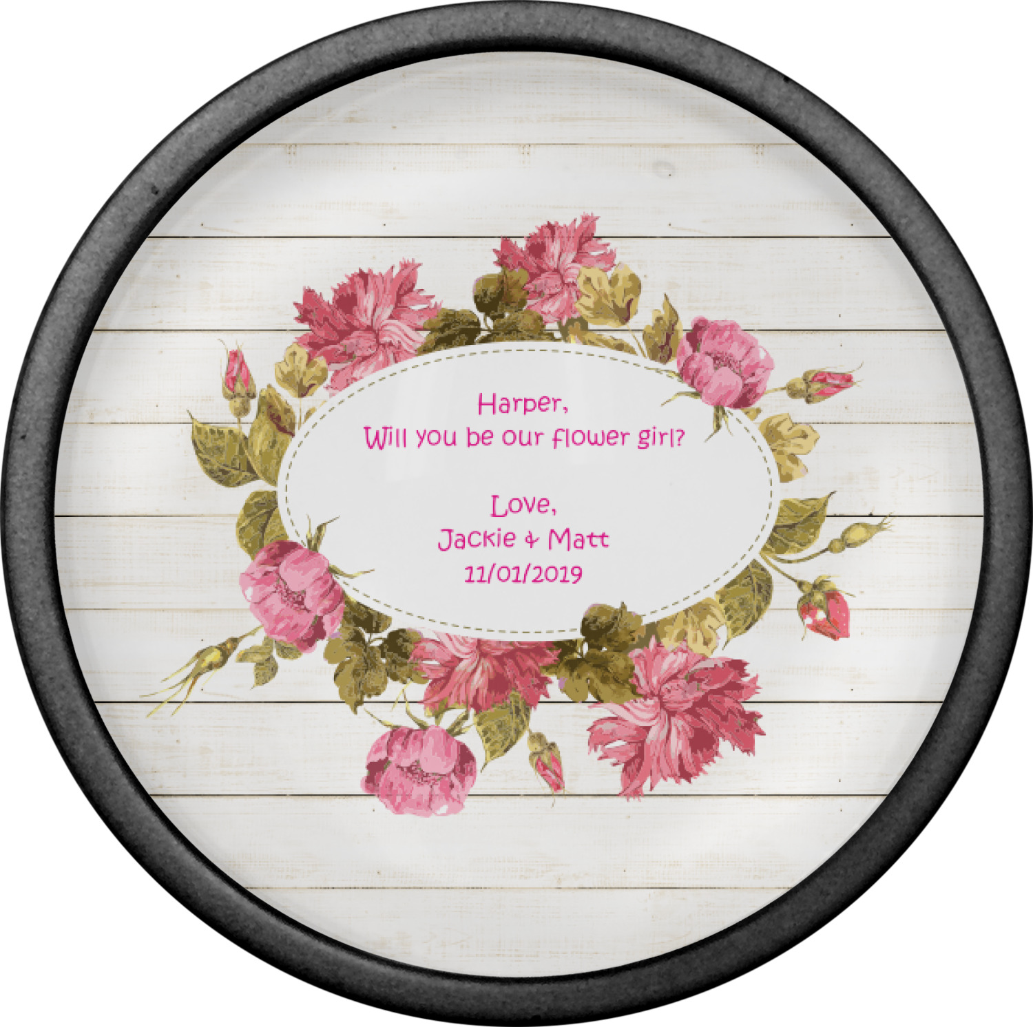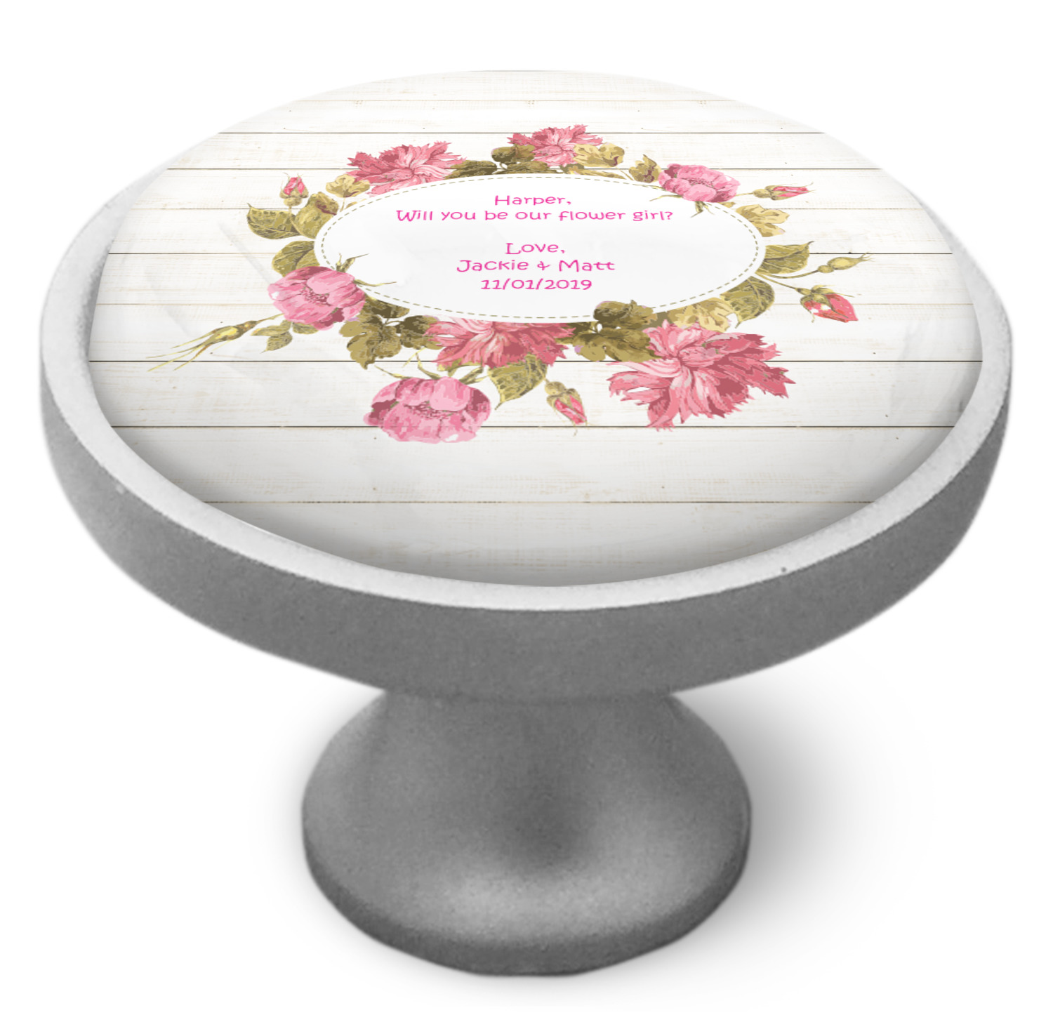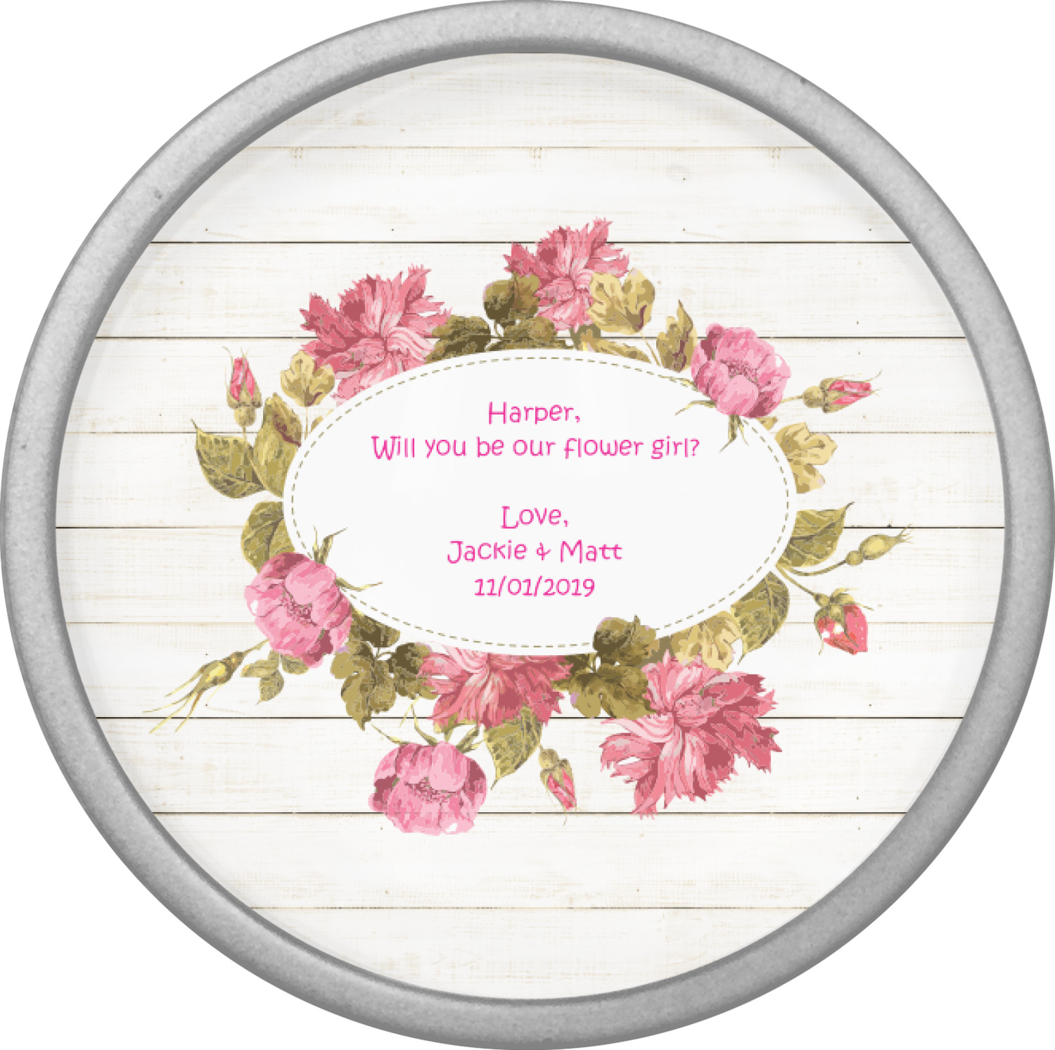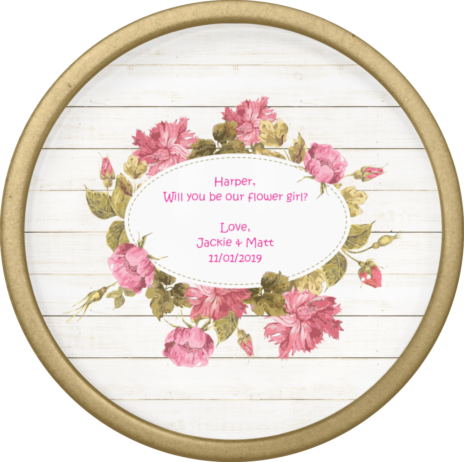 The main design has a background of weathered wooden planks. A beautiful light pink flower frame is used as the focal point of this design. The pink color of the frame and the personalization inside is the perfect contrast to the light colored wood.