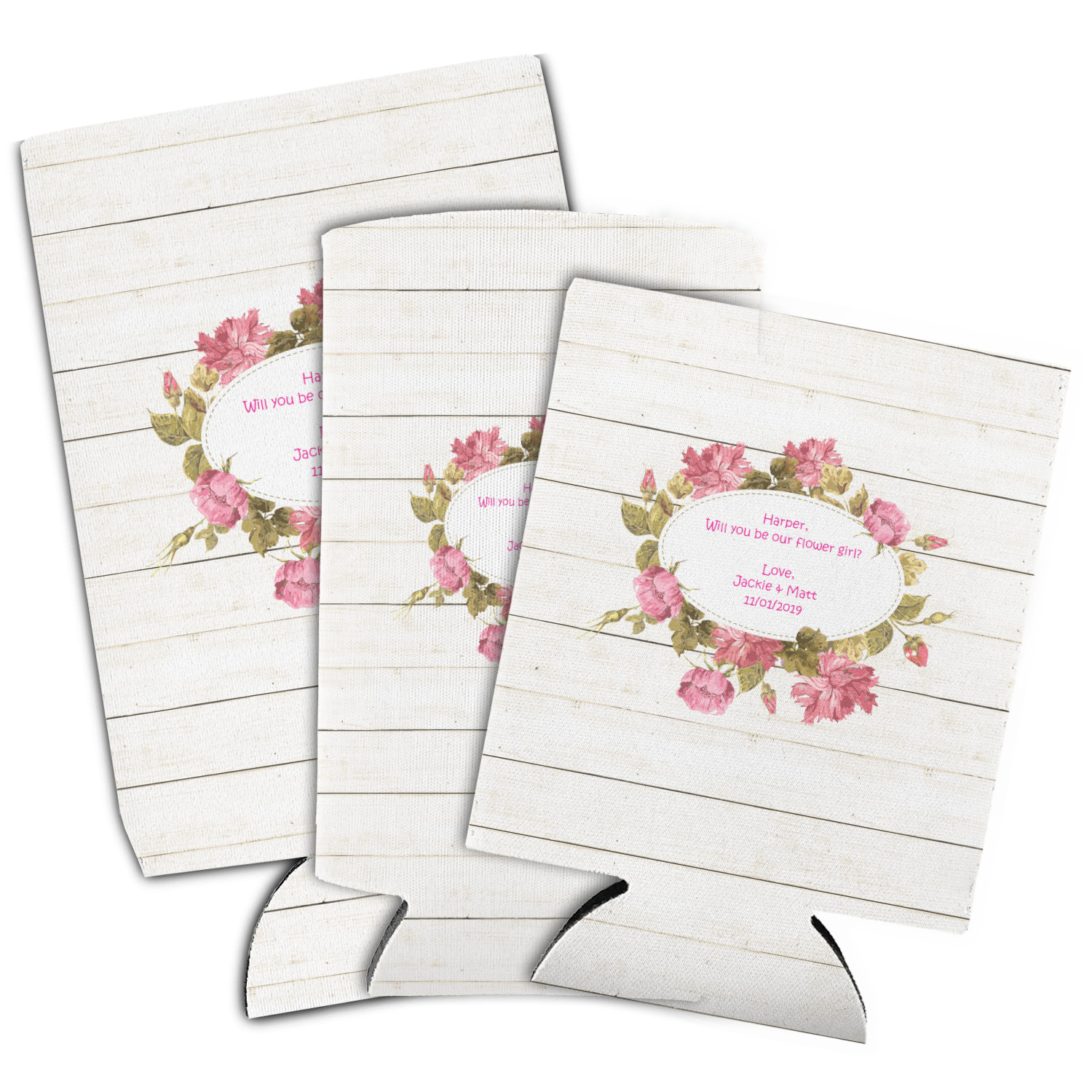 The main design has a background of weathered wooden planks. A beautiful light pink flower frame is used as the focal point of this design. The pink color of the frame and the personalization inside is the perfect contrast to the light colored wood.