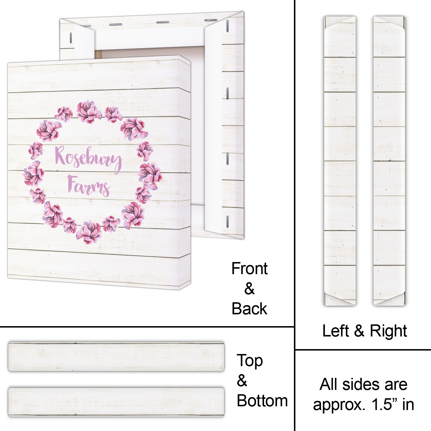 The main design has a background of weathered wooden planks. A beautiful light pink flower frame is used as the focal point of this design. The pink color of the frame and the personalization inside is the perfect contrast to the light colored wood.