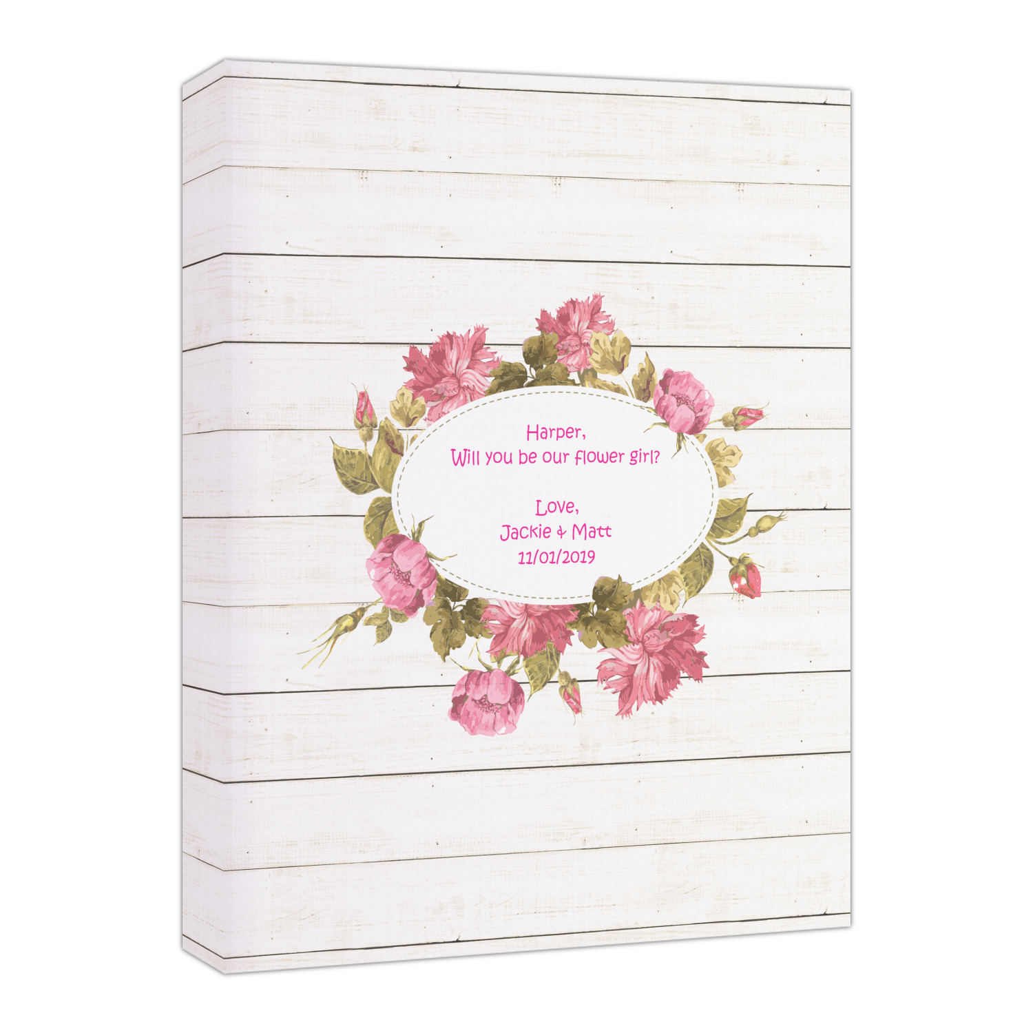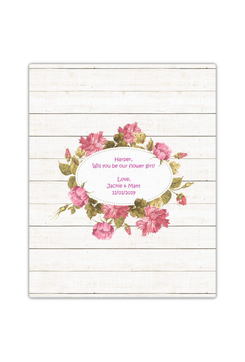 The main design has a background of weathered wooden planks. A beautiful light pink flower frame is used as the focal point of this design. The pink color of the frame and the personalization inside is the perfect contrast to the light colored wood.