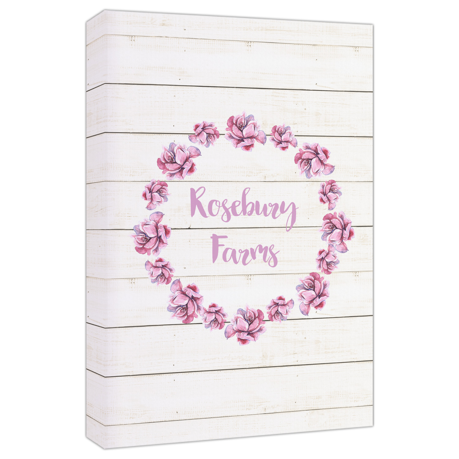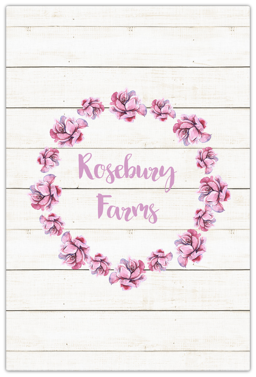 The main design has a background of weathered wooden planks. A beautiful light pink flower frame is used as the focal point of this design. The pink color of the frame and the personalization inside is the perfect contrast to the light colored wood.
