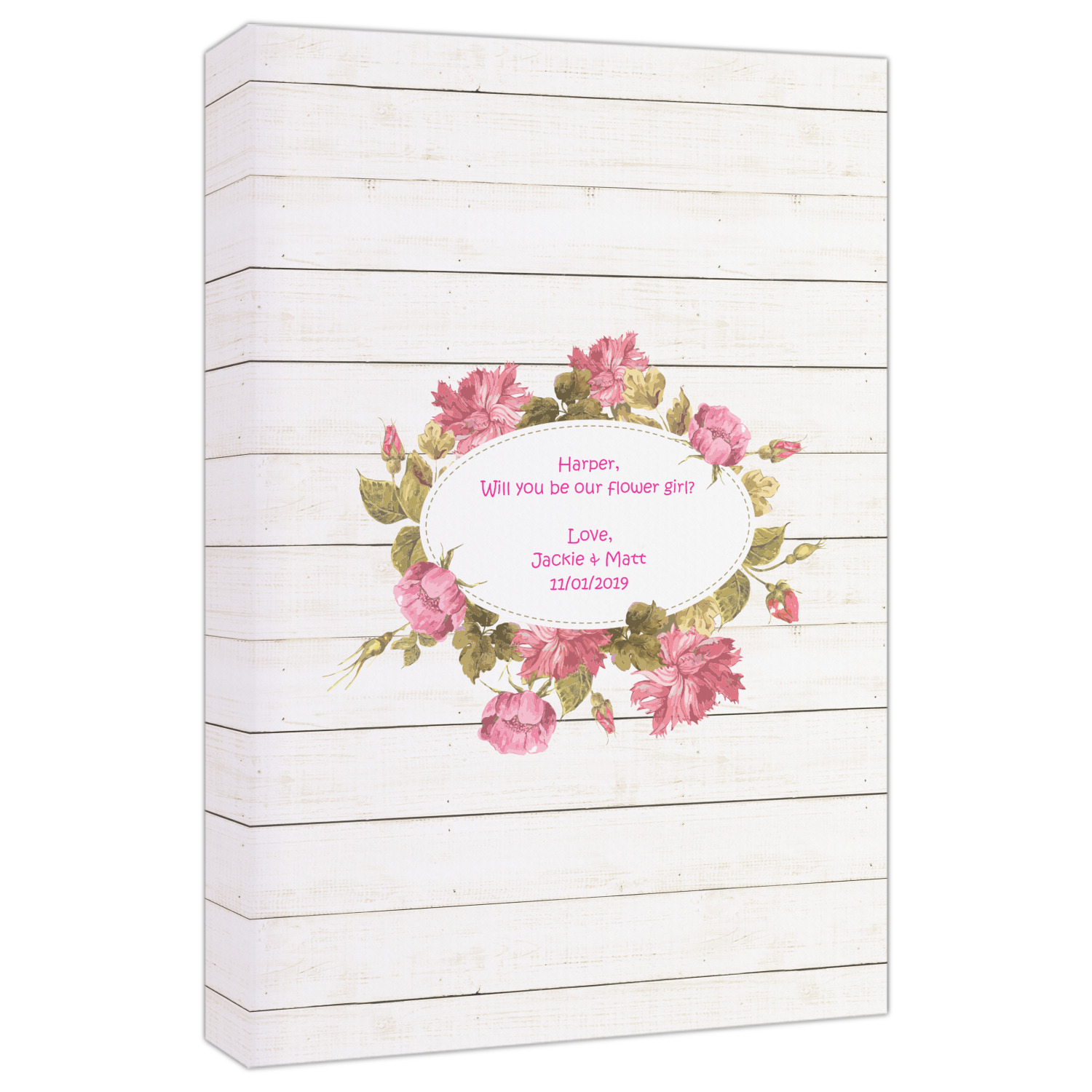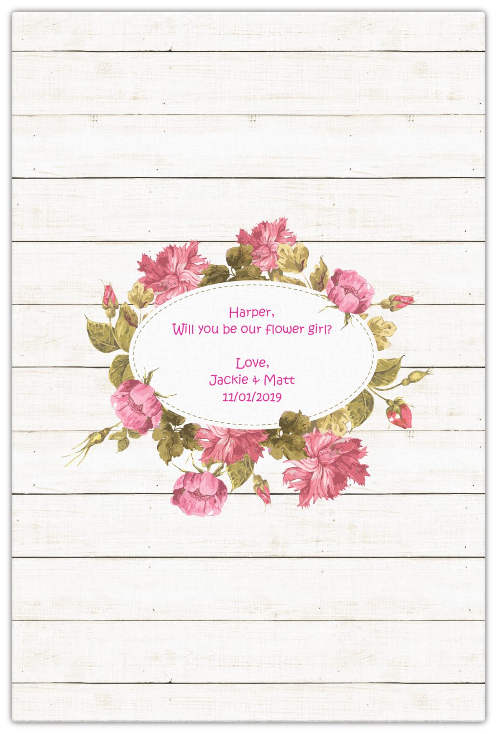 The main design has a background of weathered wooden planks. A beautiful light pink flower frame is used as the focal point of this design. The pink color of the frame and the personalization inside is the perfect contrast to the light colored wood.