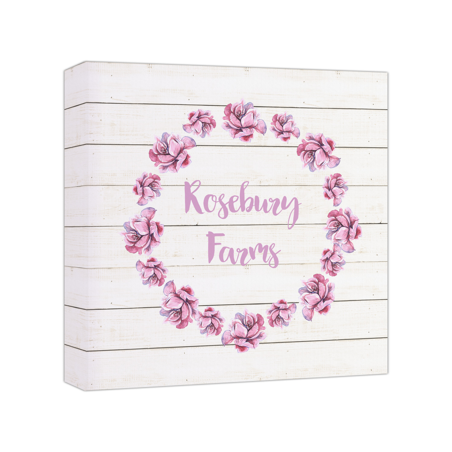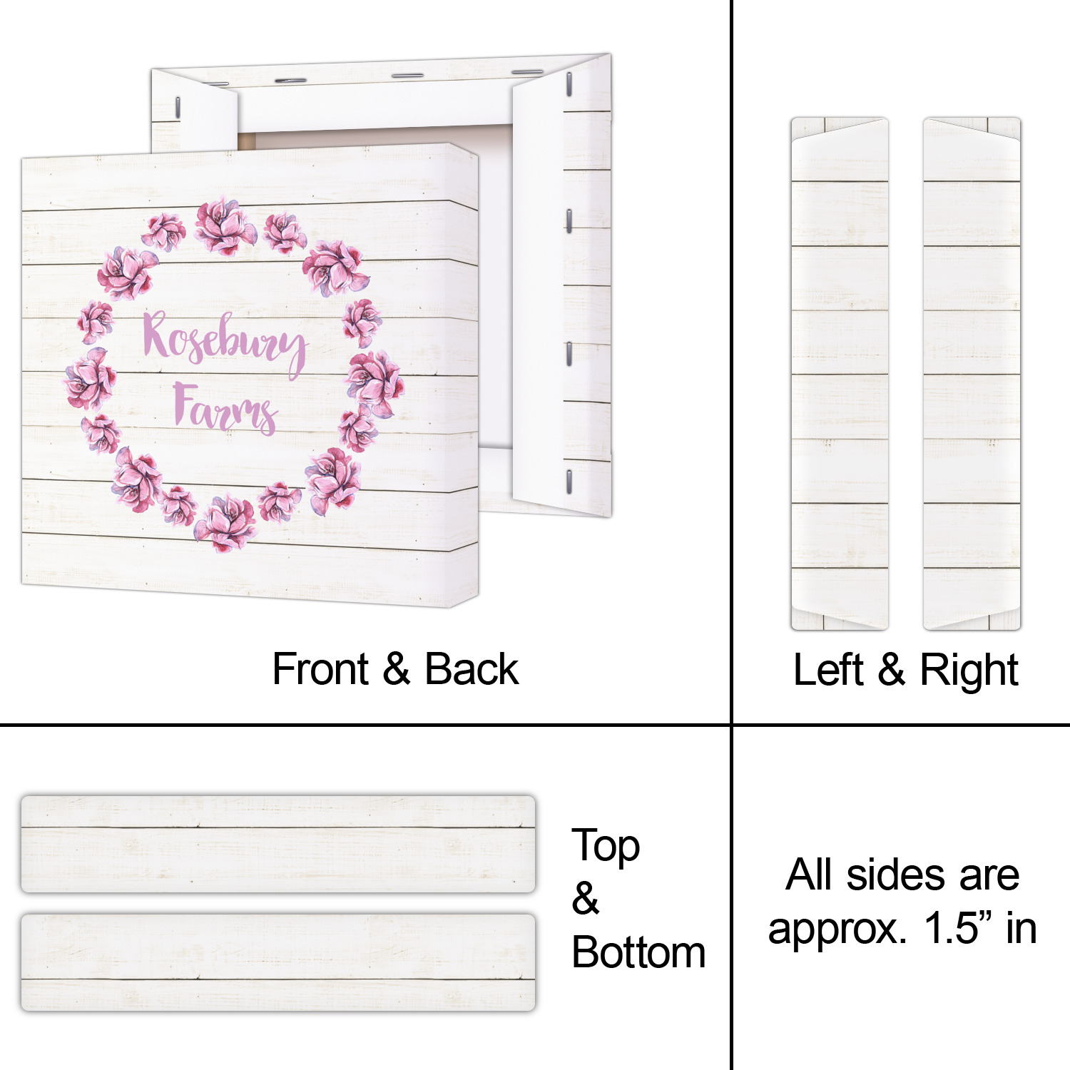 The main design has a background of weathered wooden planks. A beautiful light pink flower frame is used as the focal point of this design. The pink color of the frame and the personalization inside is the perfect contrast to the light colored wood.
