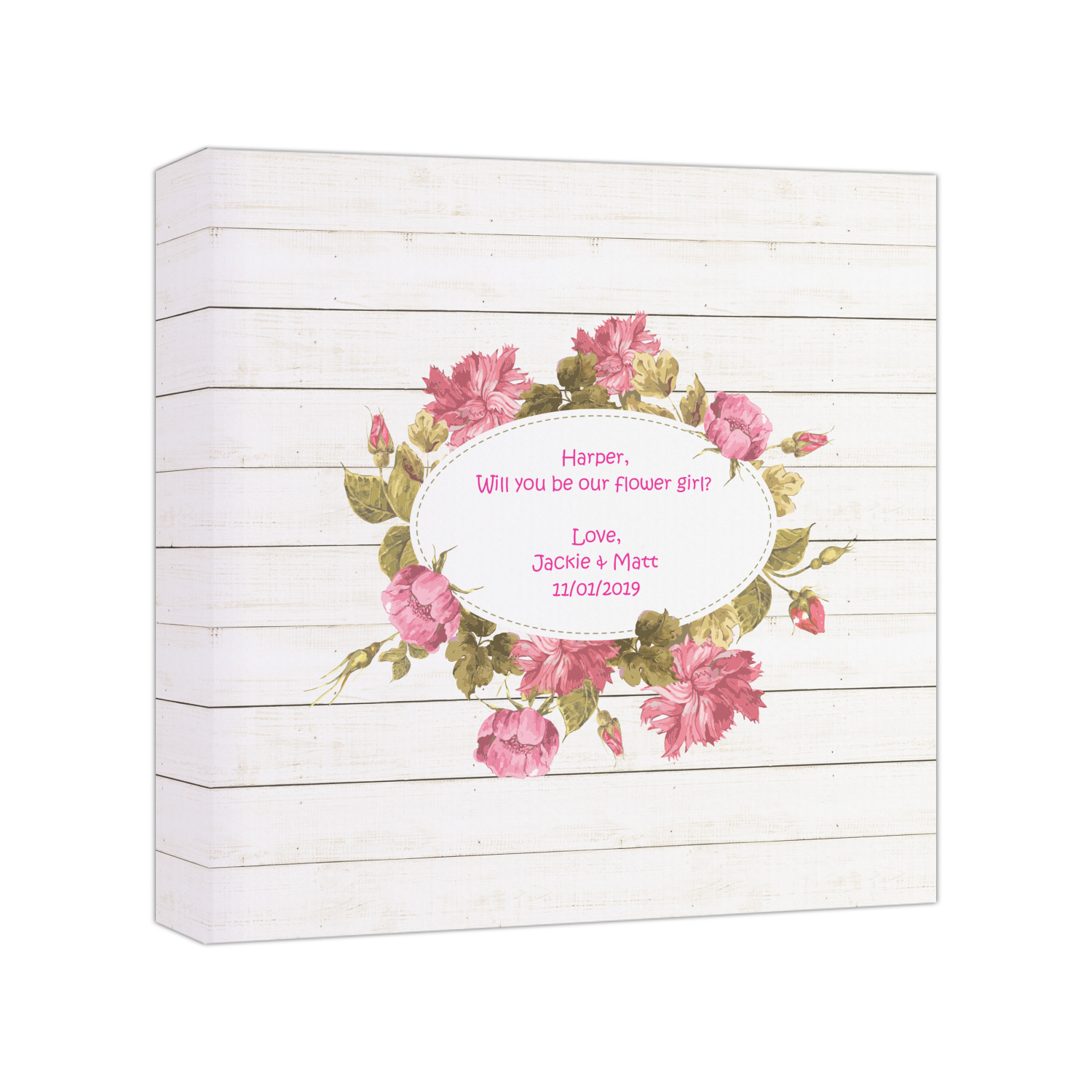 The main design has a background of weathered wooden planks. A beautiful light pink flower frame is used as the focal point of this design. The pink color of the frame and the personalization inside is the perfect contrast to the light colored wood.