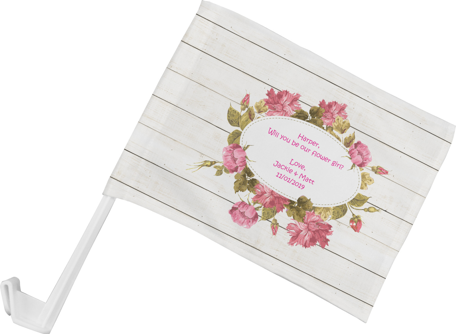 The main design has a background of weathered wooden planks. A beautiful light pink flower frame is used as the focal point of this design. The pink color of the frame and the personalization inside is the perfect contrast to the light colored wood.
