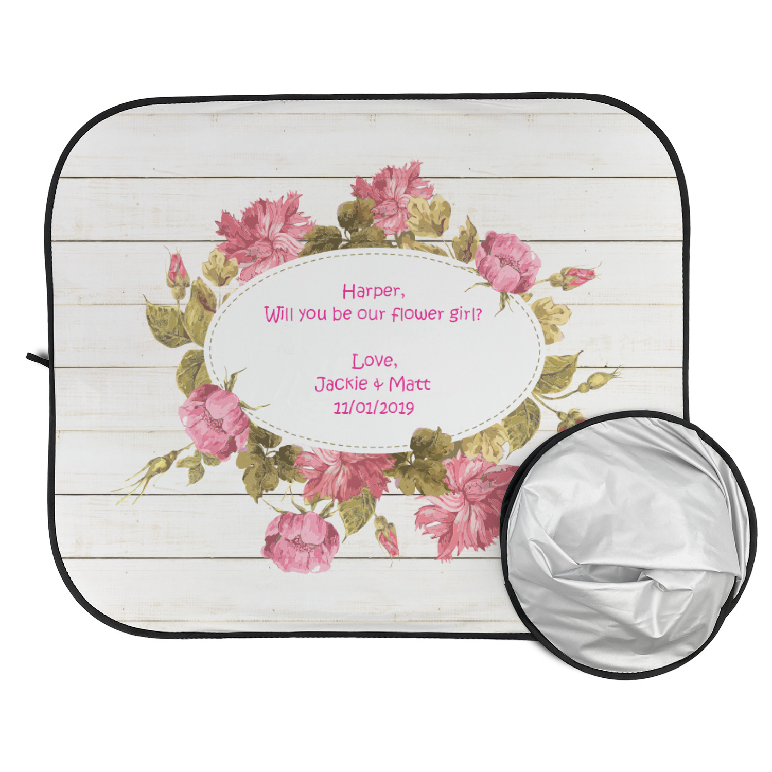 The main design has a background of weathered wooden planks. A beautiful light pink flower frame is used as the focal point of this design. The pink color of the frame and the personalization inside is the perfect contrast to the light colored wood.