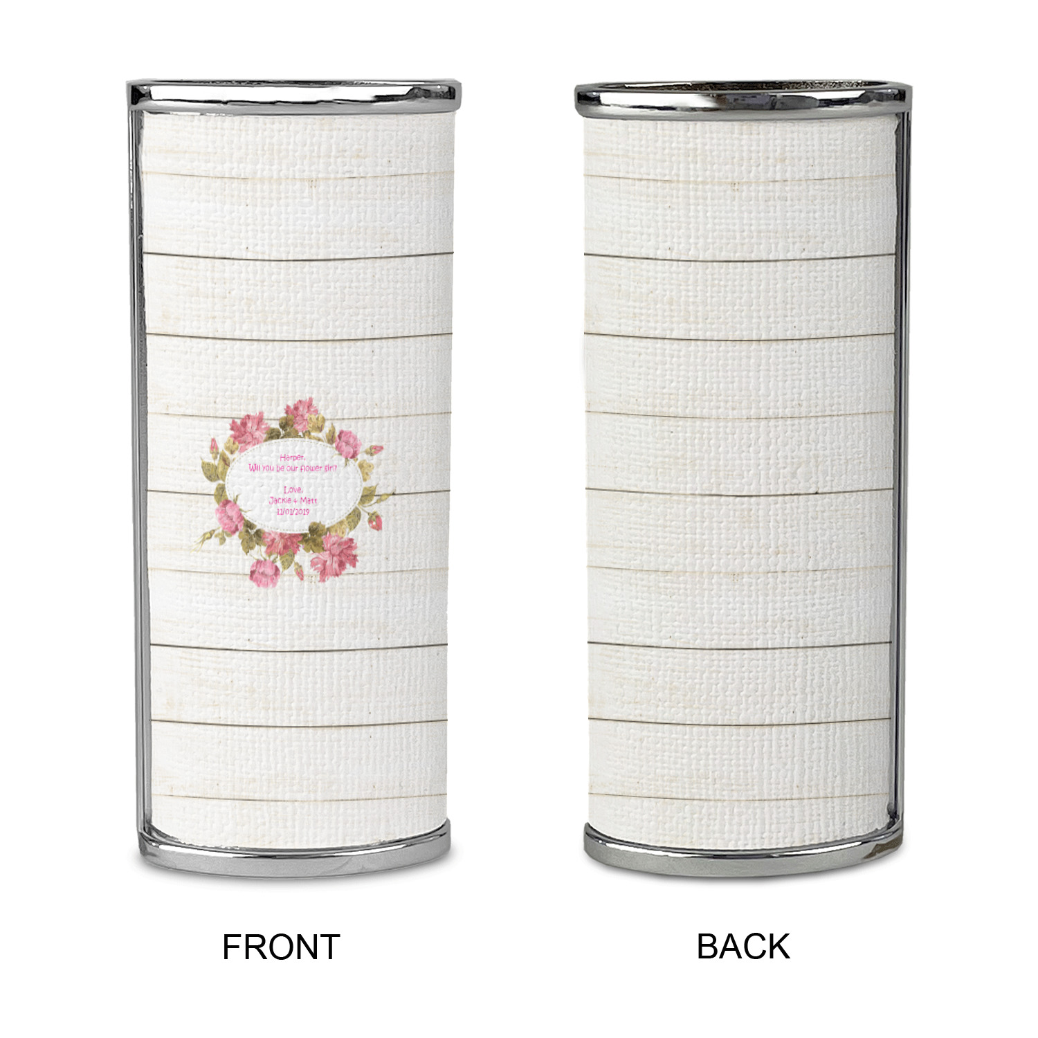 The main design has a background of weathered wooden planks. A beautiful light pink flower frame is used as the focal point of this design. The pink color of the frame and the personalization inside is the perfect contrast to the light colored wood.