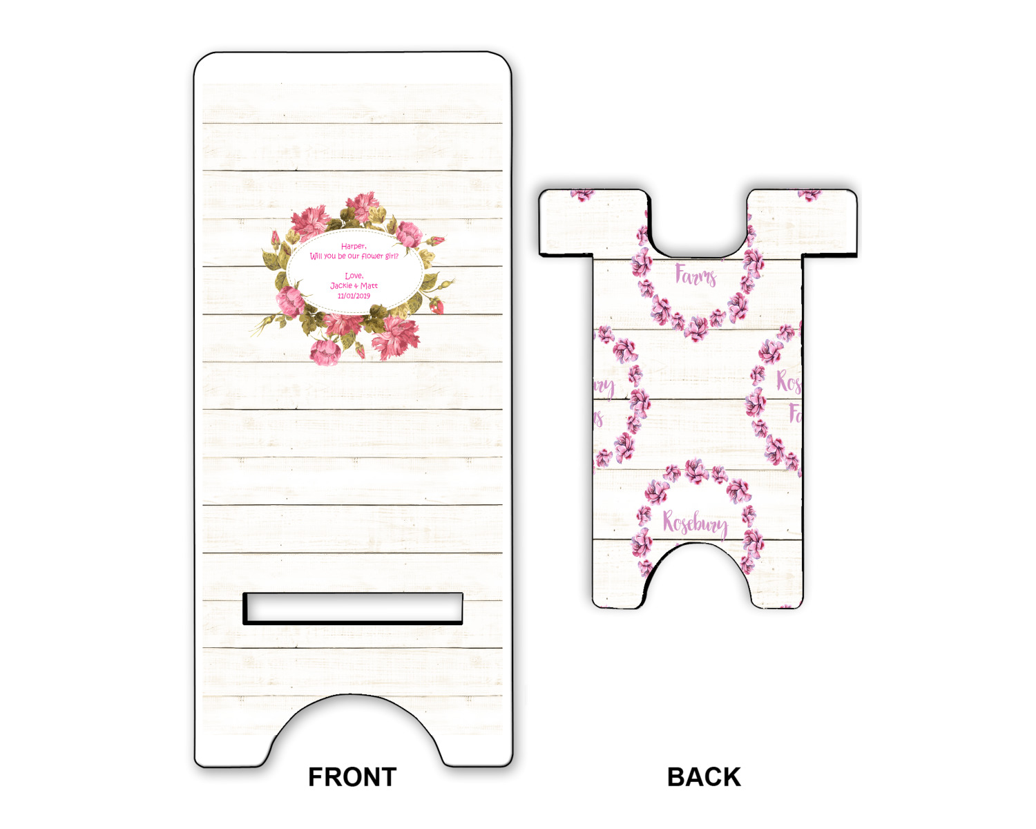 The main design has a background of weathered wooden planks. A beautiful light pink flower frame is used as the focal point of this design. The pink color of the frame and the personalization inside is the perfect contrast to the light colored wood.