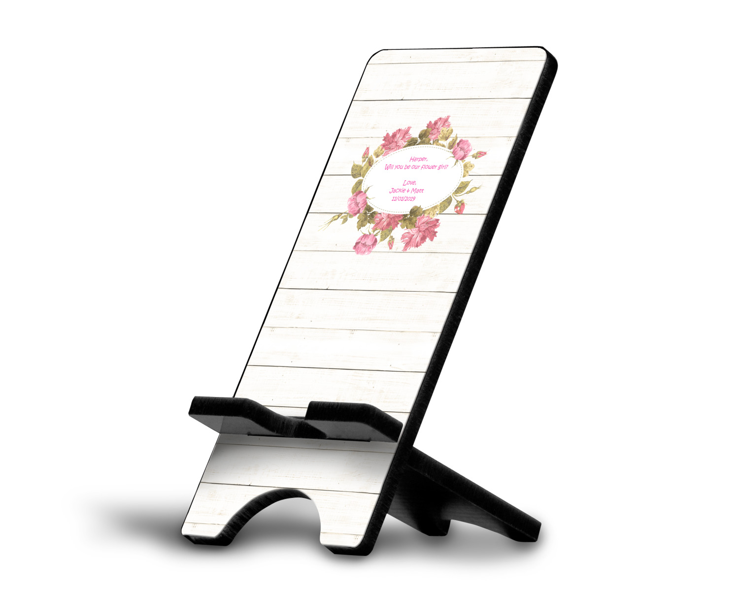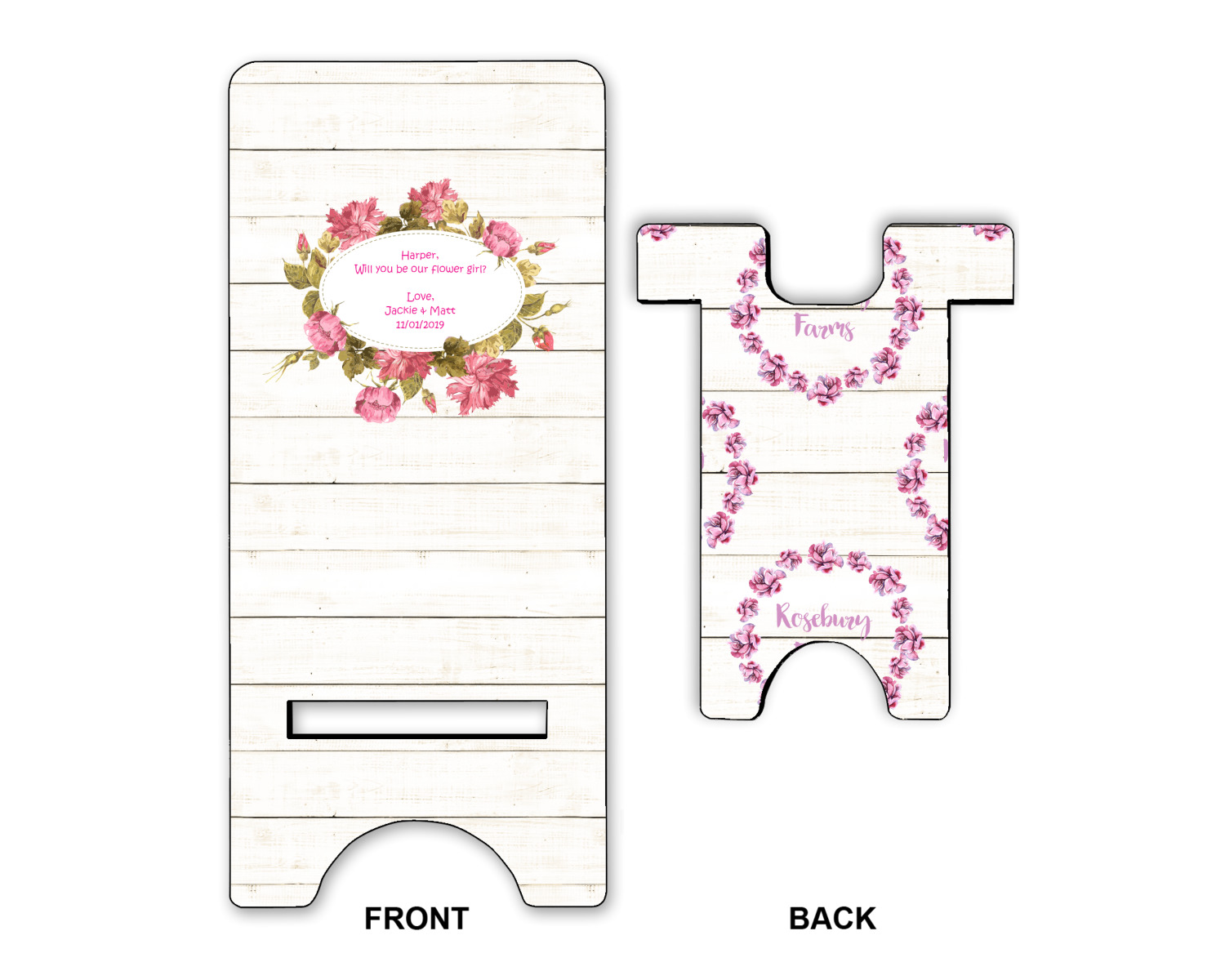 The main design has a background of weathered wooden planks. A beautiful light pink flower frame is used as the focal point of this design. The pink color of the frame and the personalization inside is the perfect contrast to the light colored wood.
