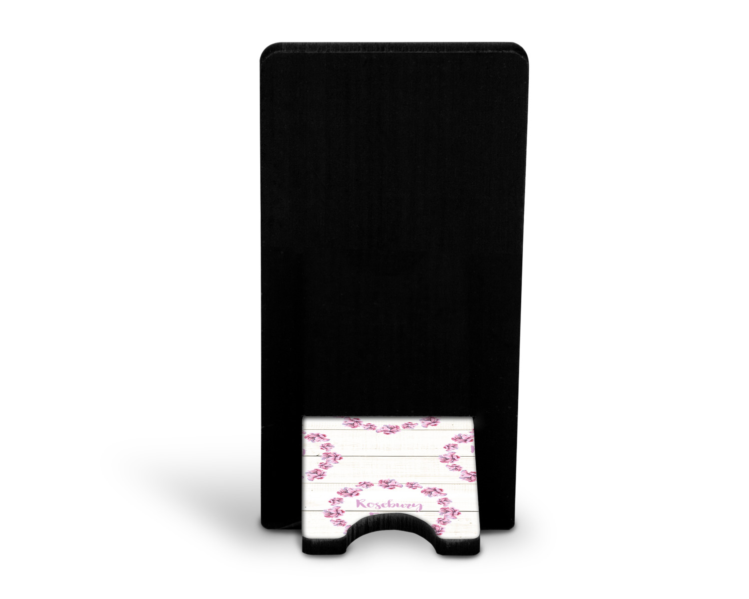 These cell phone holders are comprised of two hardboard pieces, that lock into and steady one another. The bottom part of the mobile phone stand is spacious enough to support both your phone and your charger, while it is not in use. We print your customization atop the face of this stand, while the remaining sides are a sophisticated, black color.