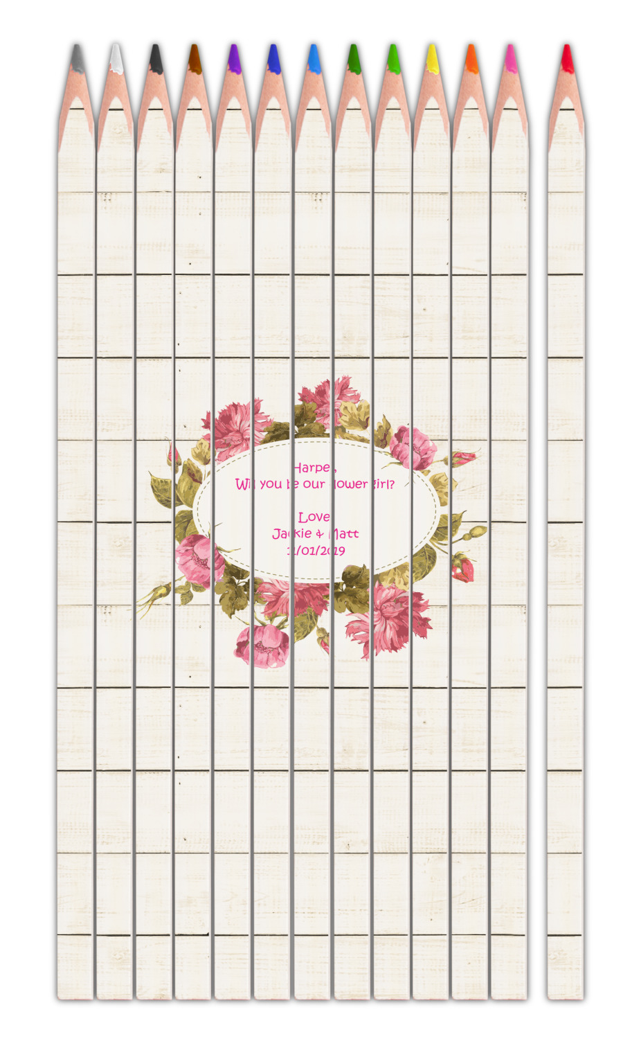The main design has a background of weathered wooden planks. A beautiful light pink flower frame is used as the focal point of this design. The pink color of the frame and the personalization inside is the perfect contrast to the light colored wood.