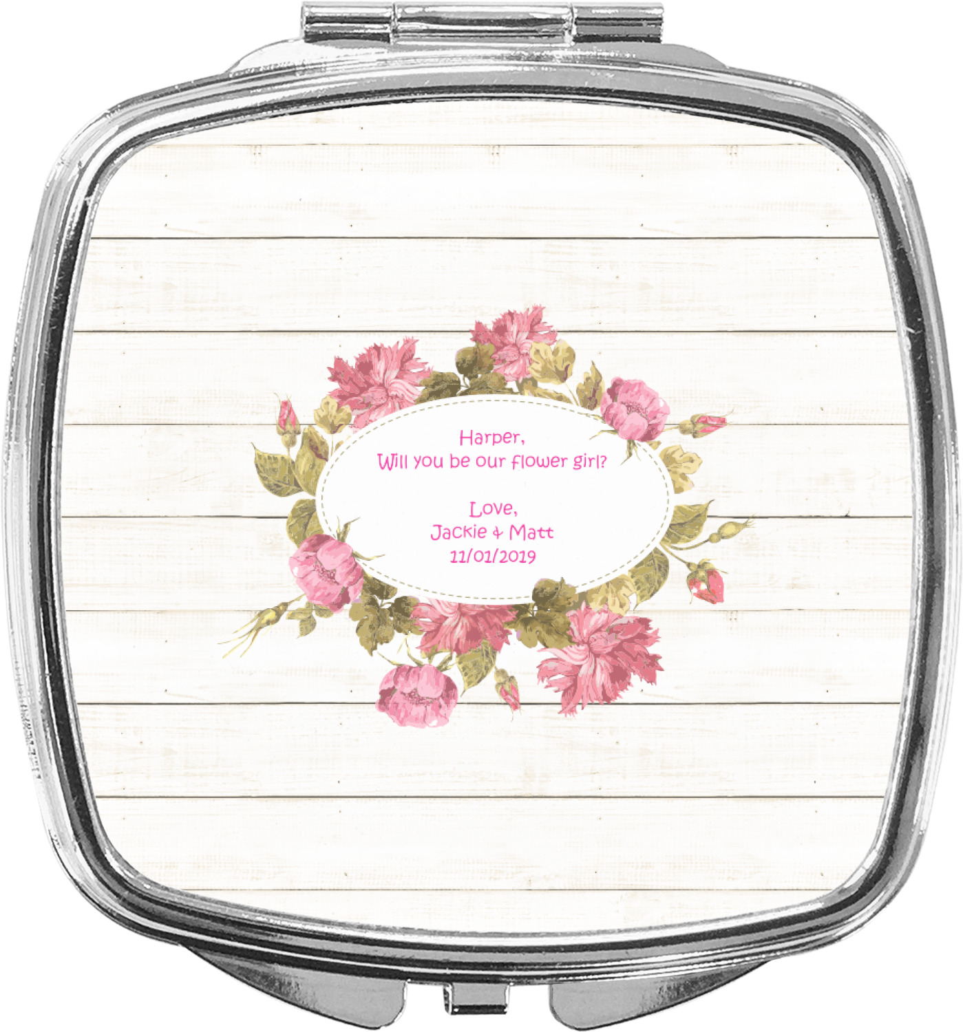 The main design has a background of weathered wooden planks. A beautiful light pink flower frame is used as the focal point of this design. The pink color of the frame and the personalization inside is the perfect contrast to the light colored wood.