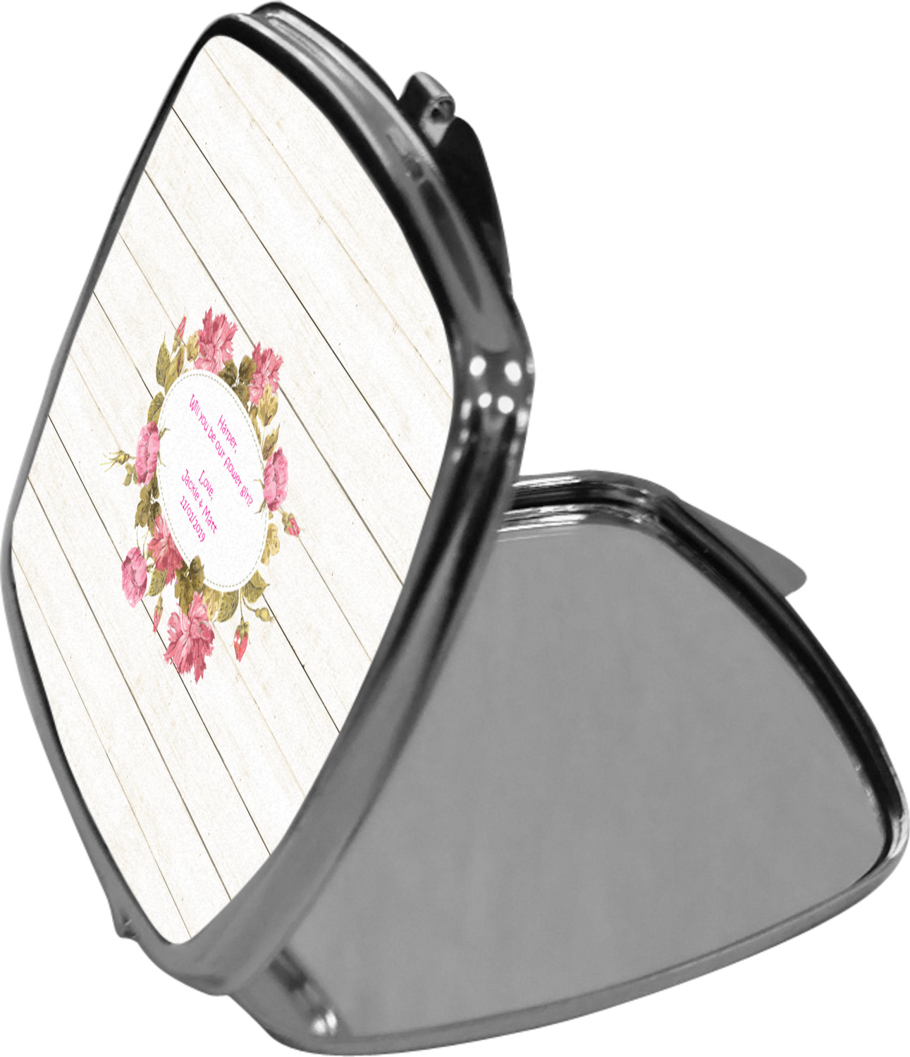 Our compact mirrors are customized with your design on one side. The other side is patterned silver tone metal. Inside, there are two mirrors.