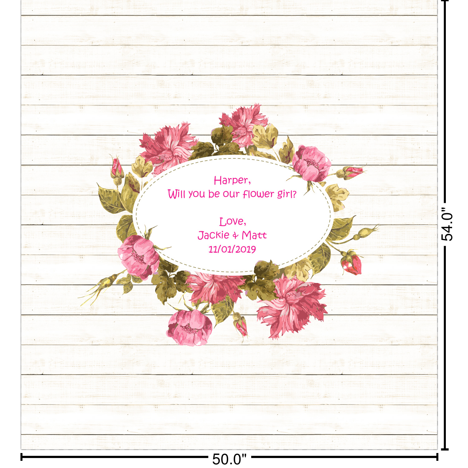 The main design has a background of weathered wooden planks. A beautiful light pink flower frame is used as the focal point of this design. The pink color of the frame and the personalization inside is the perfect contrast to the light colored wood.