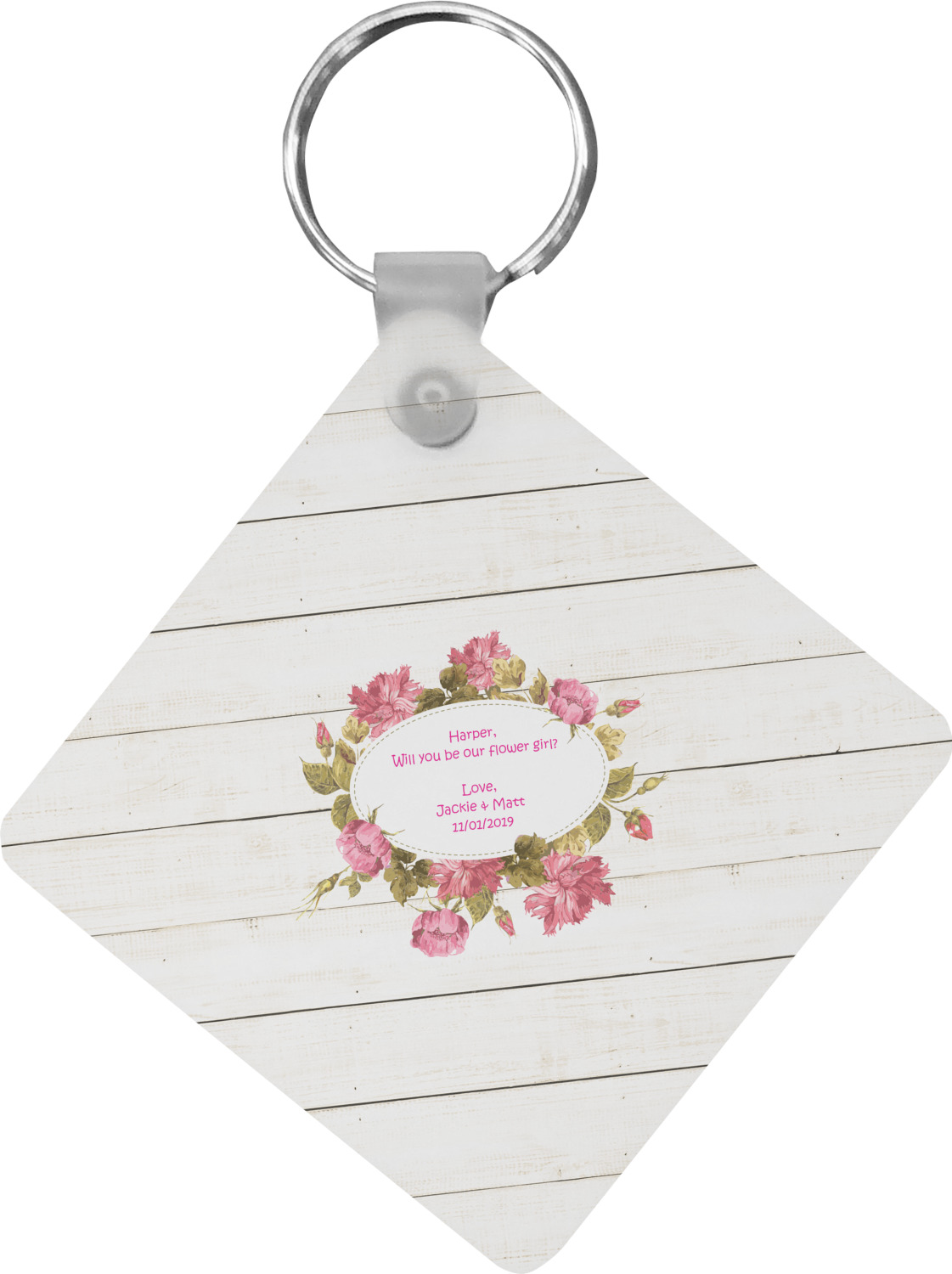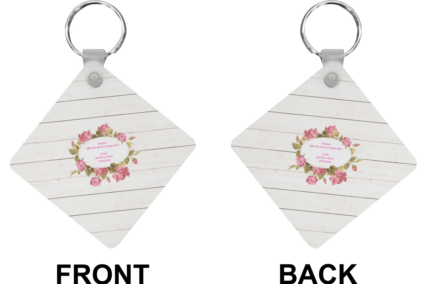Our personalized keychains attach to the included metal, split key ring with a plastic, removable snap. Since a metal ring is included with your purchase, you have the liberty to keep your keys together on the ring, with or without your unique keychain. We offer this keychain in three different shapes: circle, heart, or diamond. We print your personalized design(s) on both sides of the key chain, and the surface has a glossy, reflective finish that only emphasizes your design. Each keychain is approximately 2.25 by 2.25 inches.