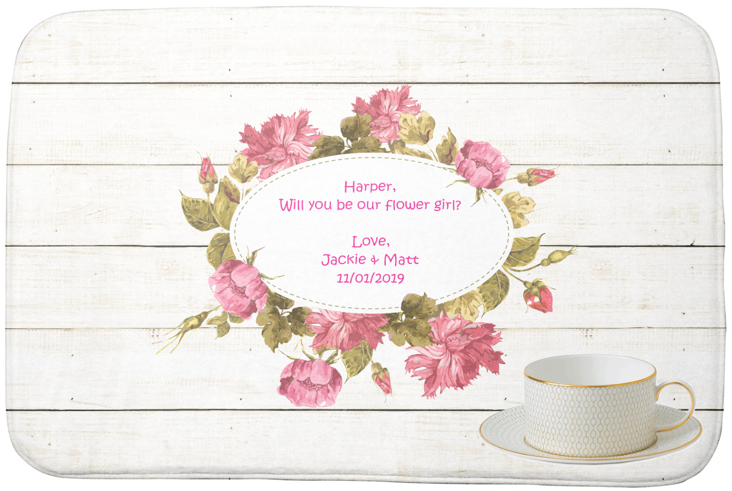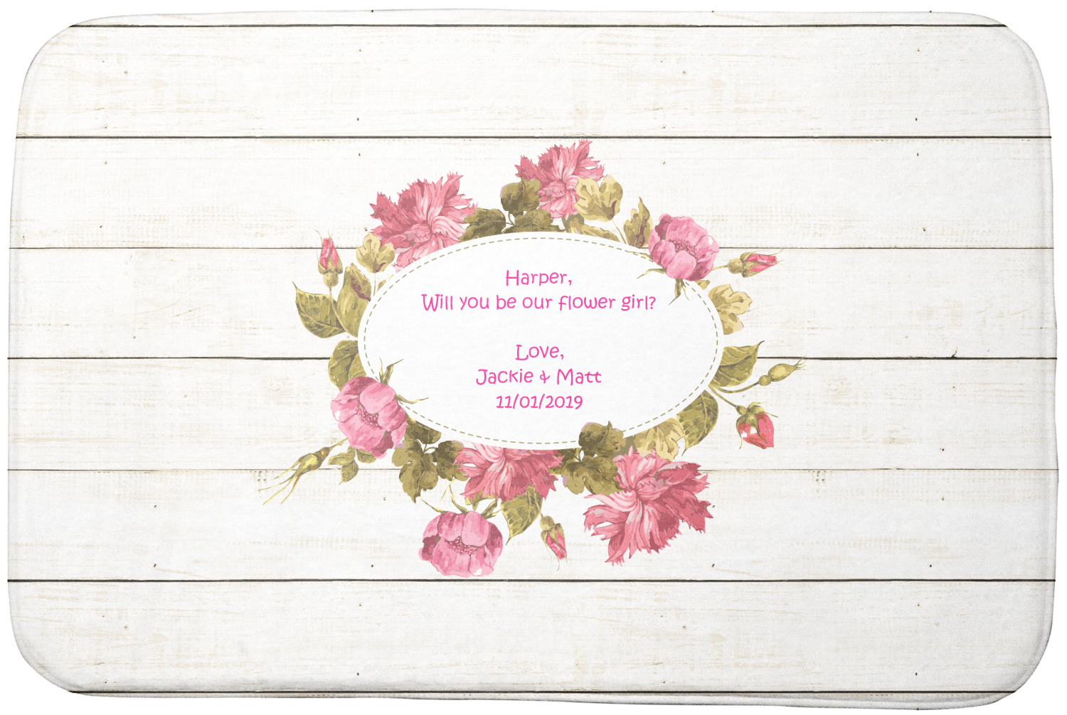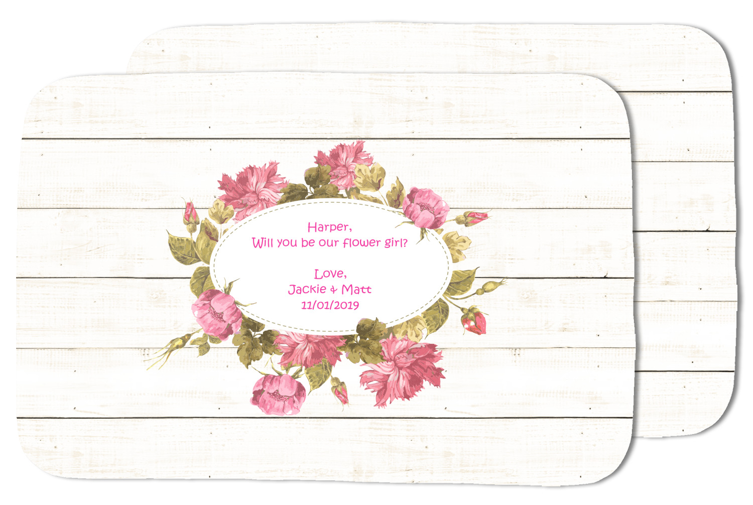 The main design has a background of weathered wooden planks. A beautiful light pink flower frame is used as the focal point of this design. The pink color of the frame and the personalization inside is the perfect contrast to the light colored wood.