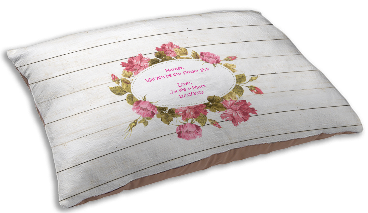 The main design has a background of weathered wooden planks. A beautiful light pink flower frame is used as the focal point of this design. The pink color of the frame and the personalization inside is the perfect contrast to the light colored wood.