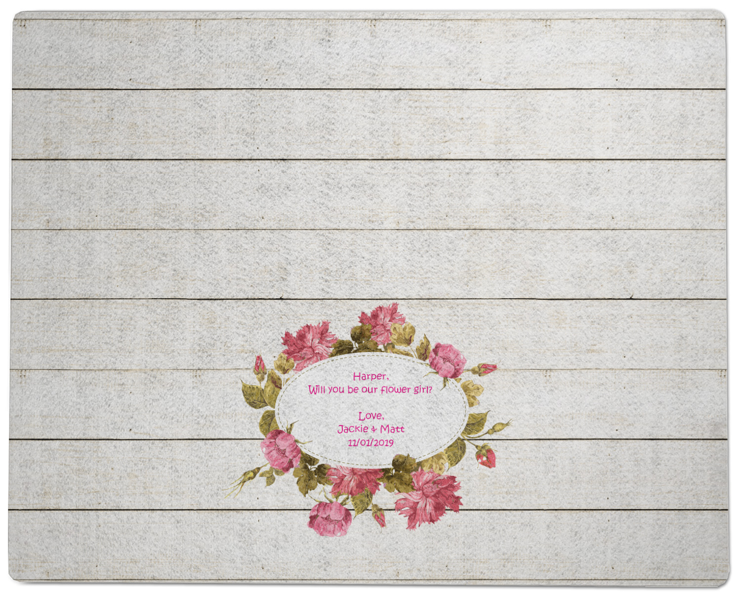 The main design has a background of weathered wooden planks. A beautiful light pink flower frame is used as the focal point of this design. The pink color of the frame and the personalization inside is the perfect contrast to the light colored wood.
