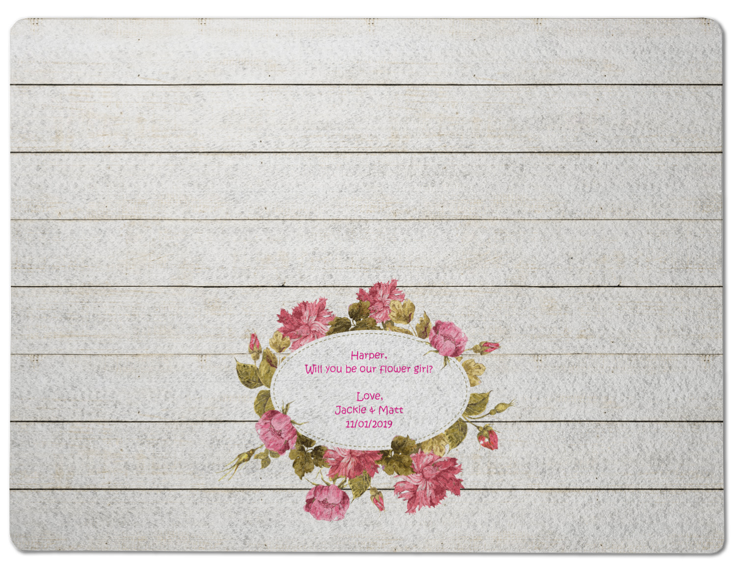 The main design has a background of weathered wooden planks. A beautiful light pink flower frame is used as the focal point of this design. The pink color of the frame and the personalization inside is the perfect contrast to the light colored wood.