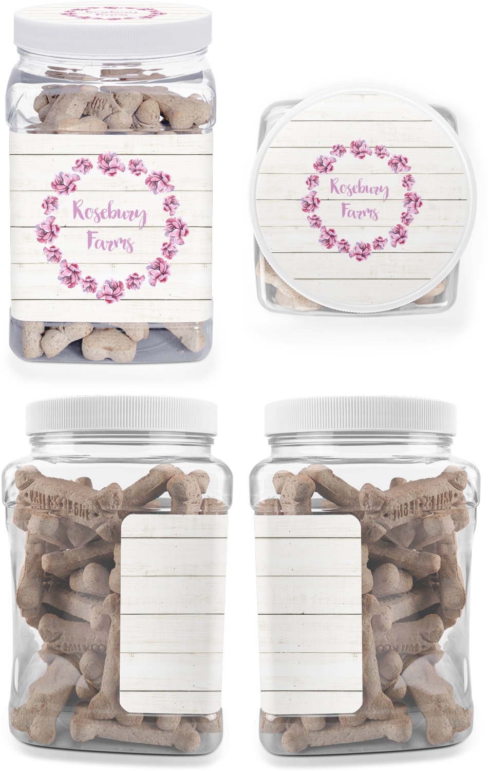 This half gallon jar, made from a sturdy plastic, is the perfect way to keep treats from any naughty pet paws, while still keeping them ready on hand for when your pup performs an impressive trick. This dog cookie jar features a screw-on, white lid that displays your personalized design on a vinyl sticker. We apply another customized sticker that wraps around the front and sides of the jar. Our dog treat jar also has indentations on the rear ends of the sides, which allows for convenient handling, and its square frame allows for easy storage.