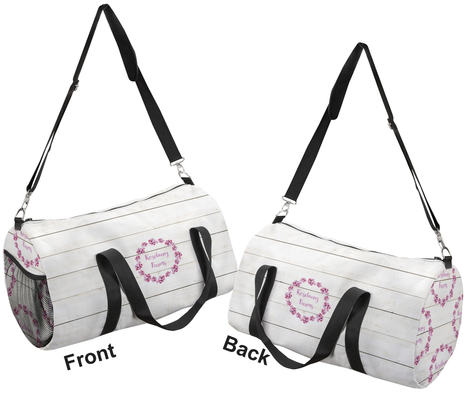 This duffle is a sturdy bag made of a canvas material. It comes in two sizes: Small (19"W x 9.5"H x 9.5"D) and Large (23"W x 12"H x 12"D). The bag is a cylindrical shape with a black adjustable strap and two handles. On one side is an elastic pouch to put a waterbottle or other small item. Your product will be sublimated with your design and is able to be designed on the front, back, and sides. Be sure to remember that the straps may cut into parts of your design if you upload your own artwork.