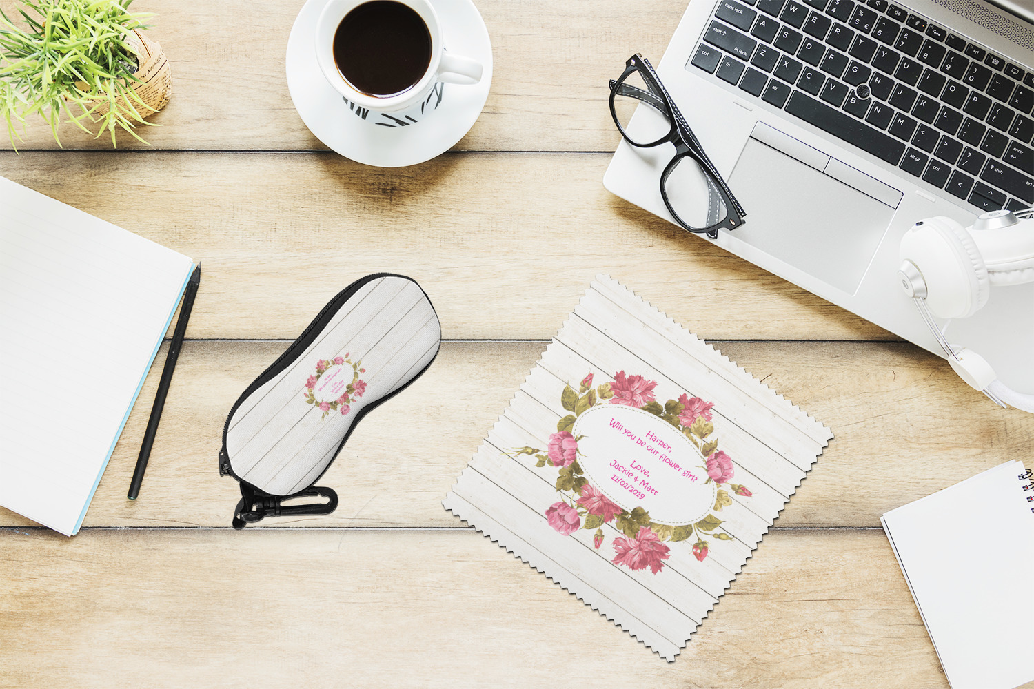 The main design has a background of weathered wooden planks. A beautiful light pink flower frame is used as the focal point of this design. The pink color of the frame and the personalization inside is the perfect contrast to the light colored wood.