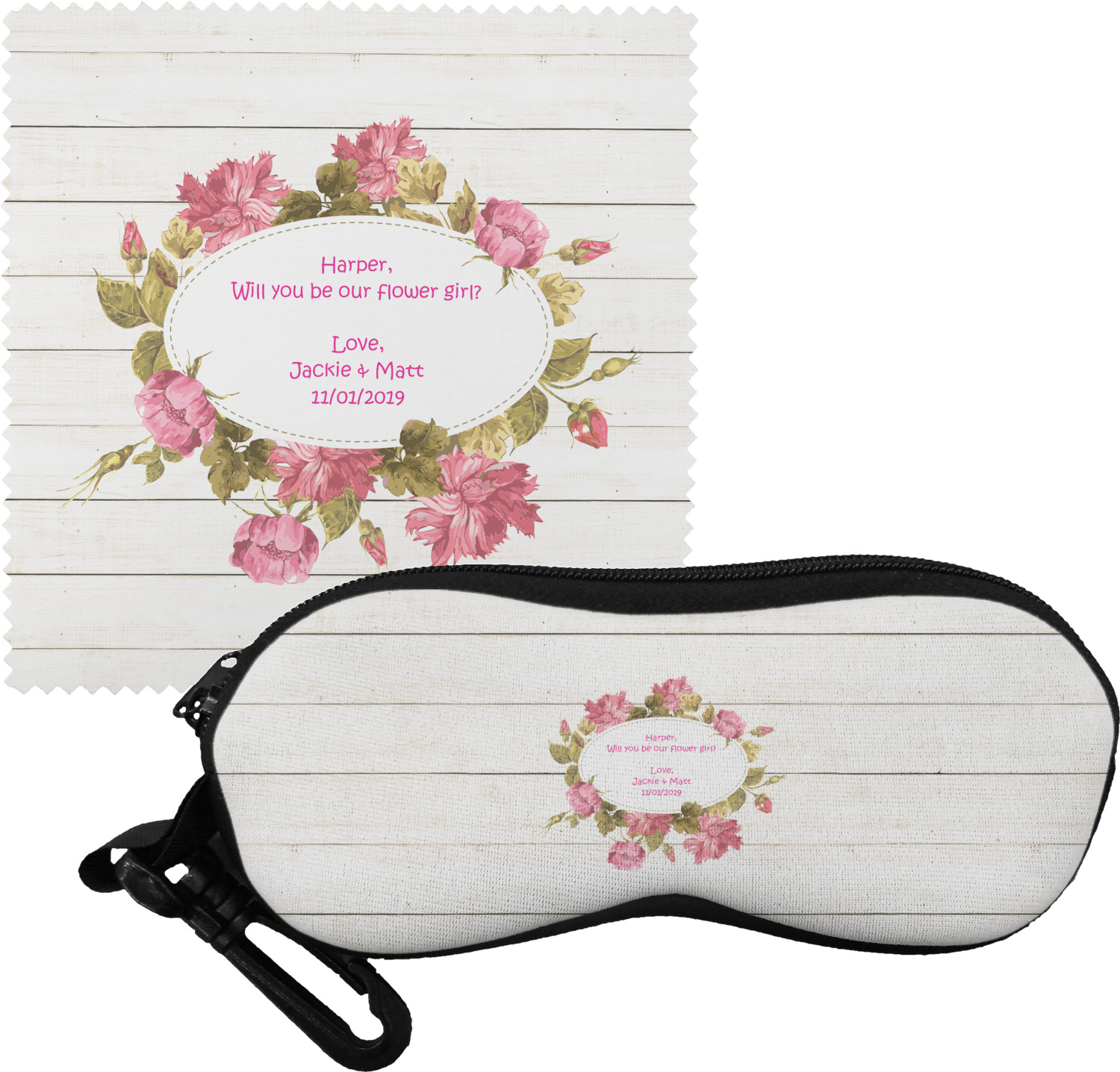 The cases have the design on both sides, a black zipper, and clips for hanging on a belt buckle or purse strap and also include matching lens cloths.