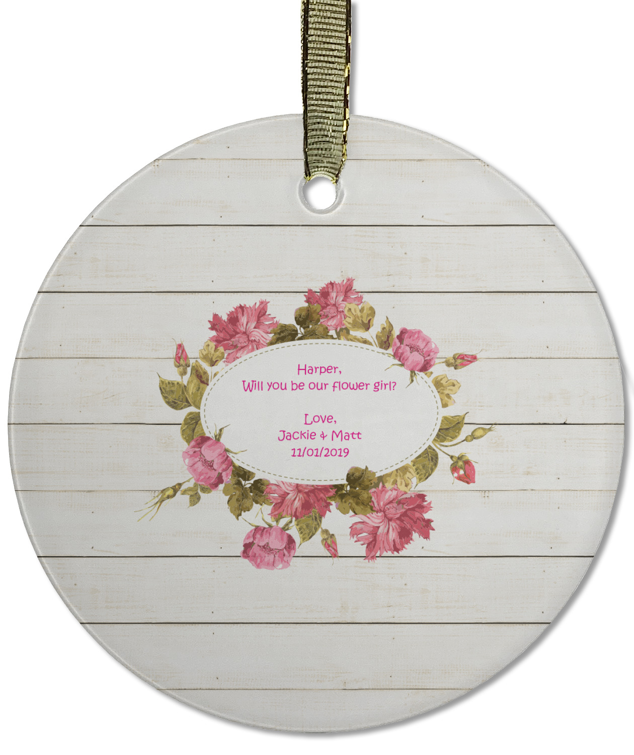 The main design has a background of weathered wooden planks. A beautiful light pink flower frame is used as the focal point of this design. The pink color of the frame and the personalization inside is the perfect contrast to the light colored wood.