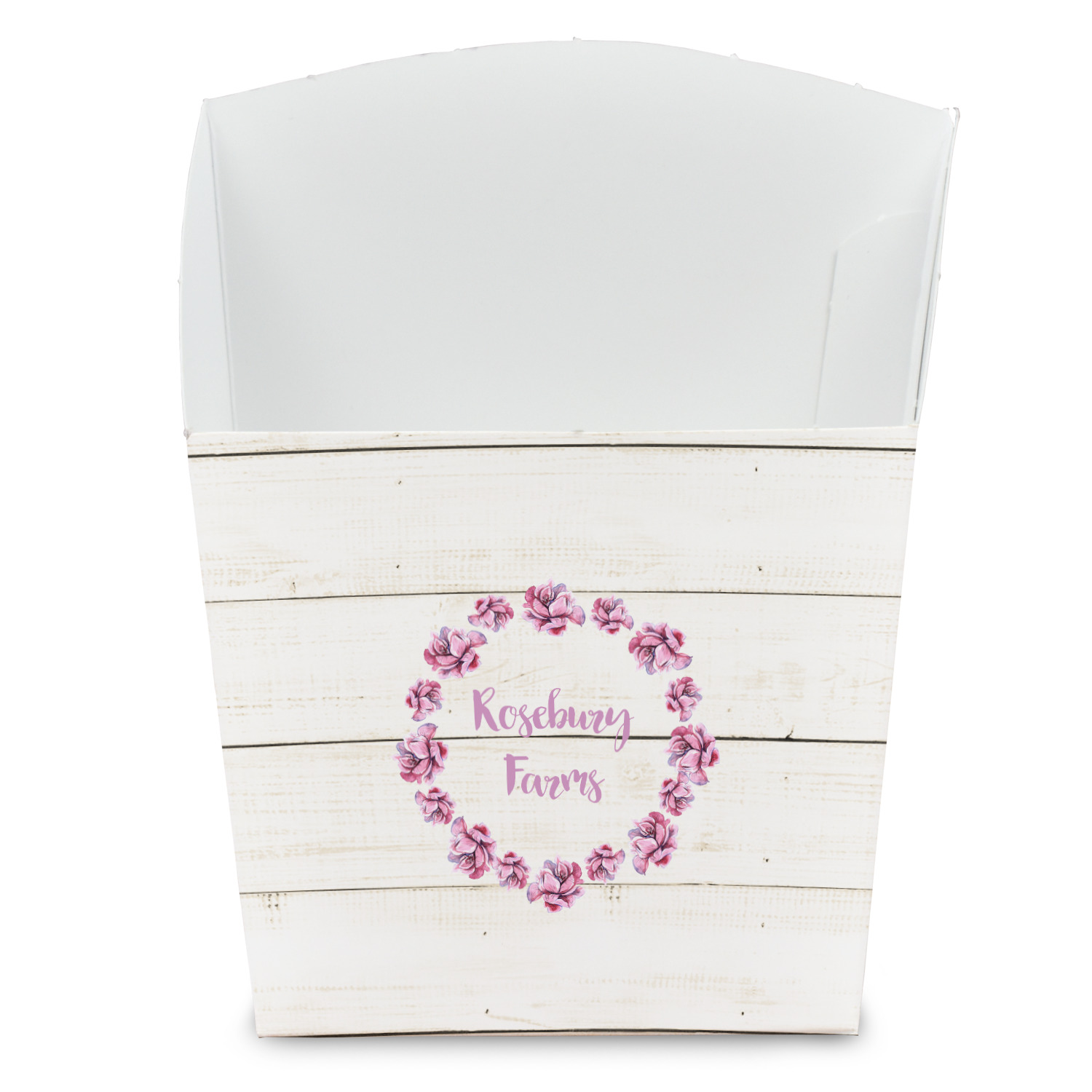 The main design has a background of weathered wooden planks. A beautiful light pink flower frame is used as the focal point of this design. The pink color of the frame and the personalization inside is the perfect contrast to the light colored wood.