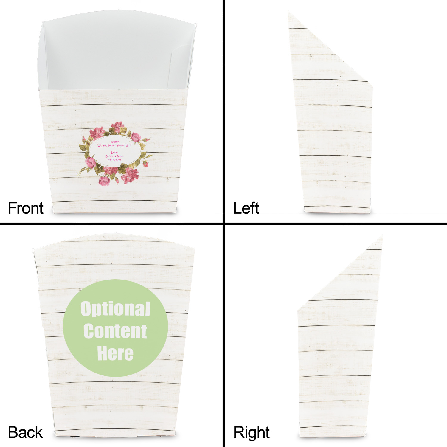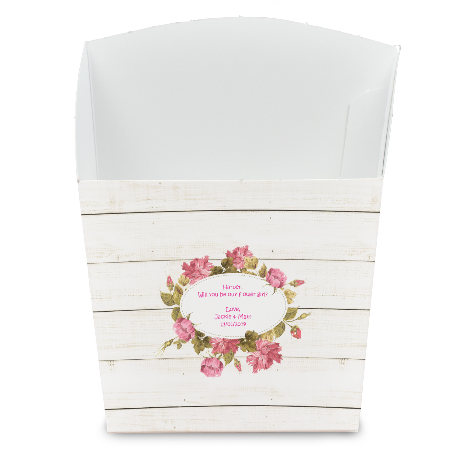 The main design has a background of weathered wooden planks. A beautiful light pink flower frame is used as the focal point of this design. The pink color of the frame and the personalization inside is the perfect contrast to the light colored wood.