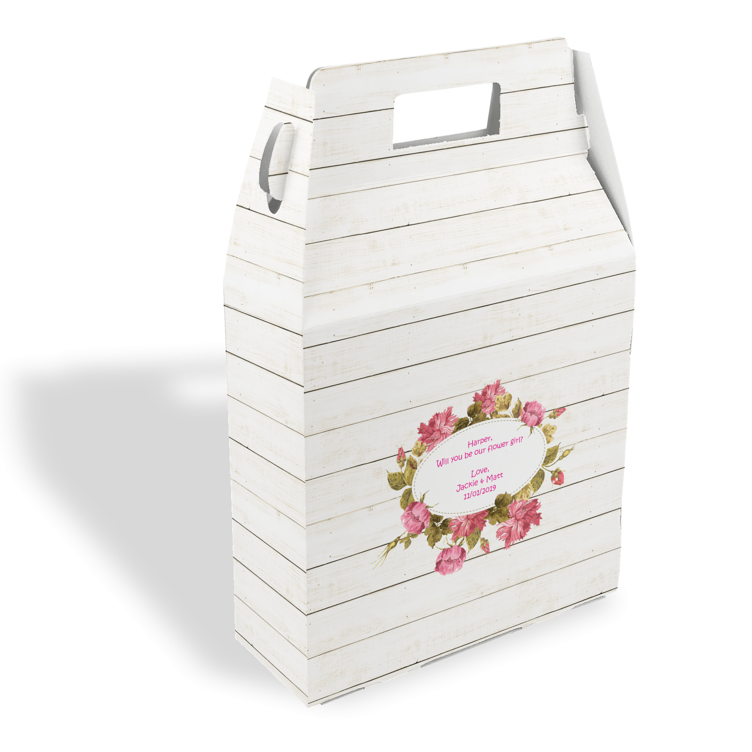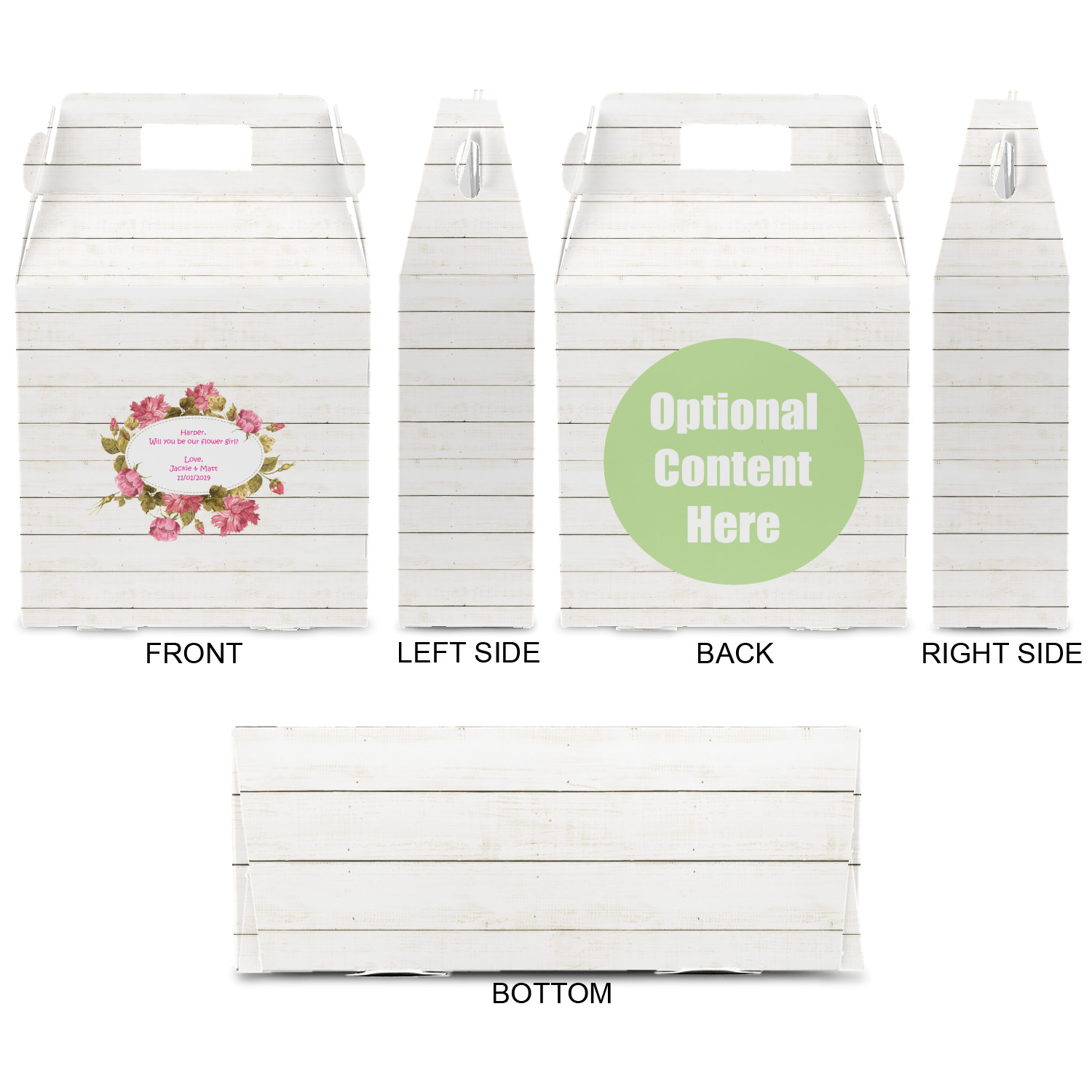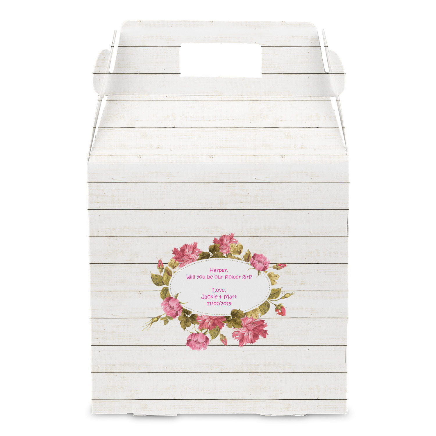 The main design has a background of weathered wooden planks. A beautiful light pink flower frame is used as the focal point of this design. The pink color of the frame and the personalization inside is the perfect contrast to the light colored wood.